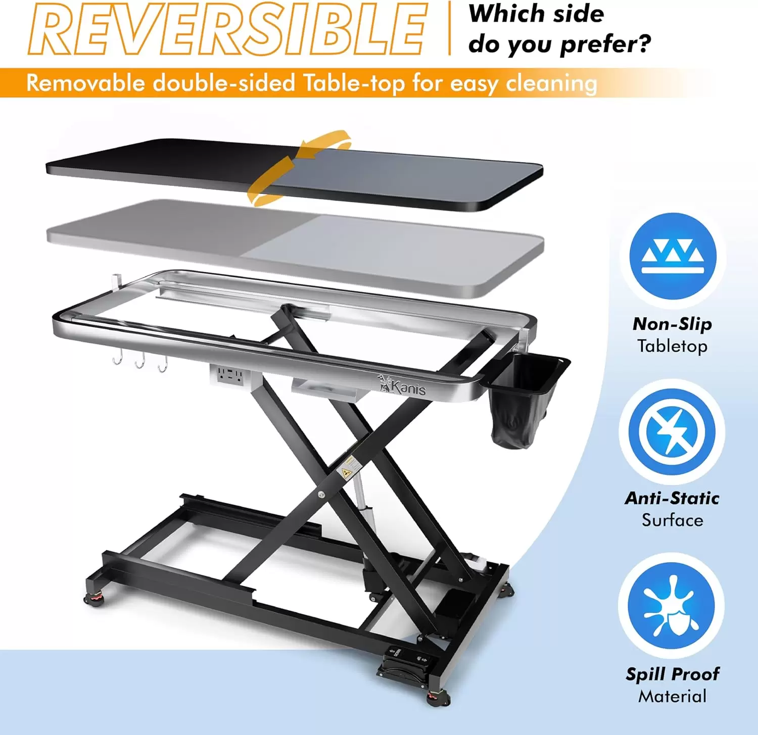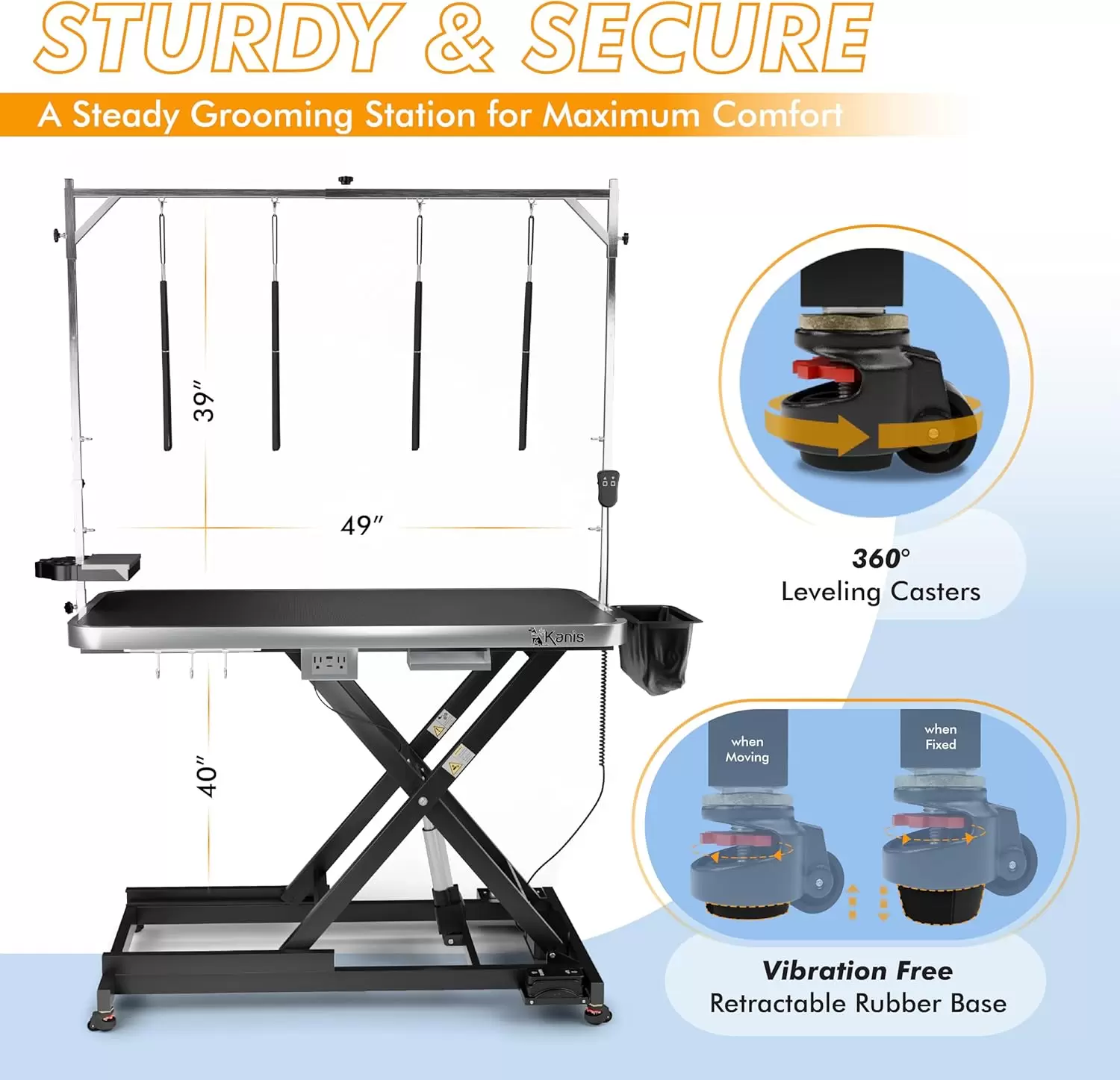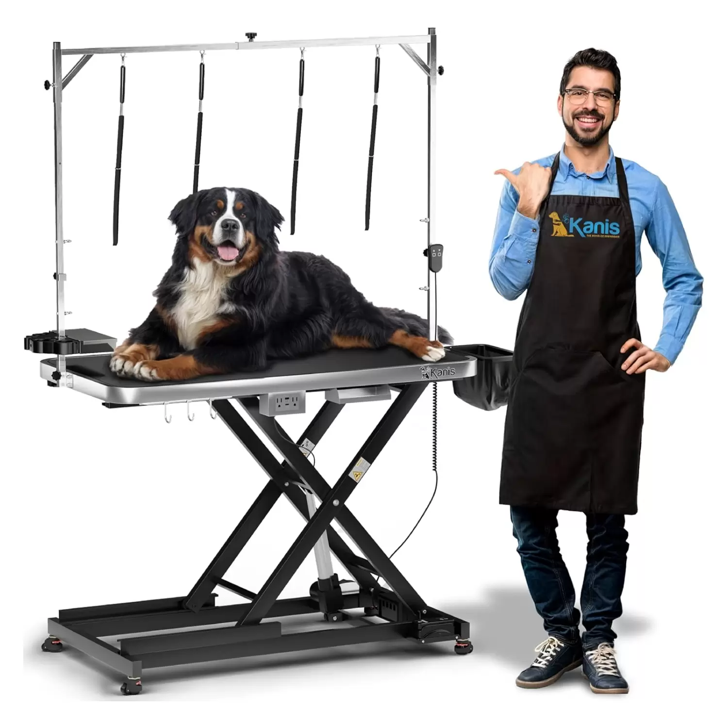 Listo para usar: conectar y usar: KANIS ofrece mesas de aseo de perros de rendimiento superior, duraderas y fiables que facilitan el aseo, cepillado, recorte, aderezo y secado para todo tipo de mascotas grandes, medianas y pequeñas. Con una capacidad de elevación de 220 libras y fácil acceso a todos los equipos de aseo de mascotas, nuestra mesa de aseo eléctrico es el compañero perfecto para cualquier profesional o peluquero doméstico.
