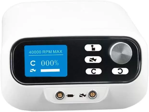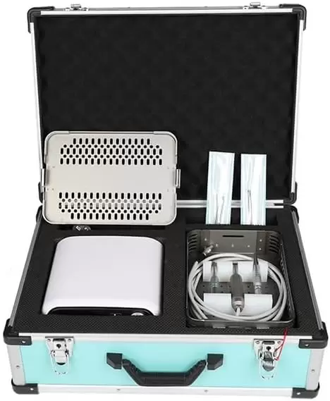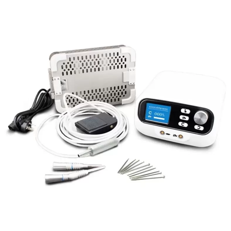 Equipo Completo: Viene con todo lo necesario para empezar a trabajar, incluyendo la consola de potencia digitalizada (controlador), una pieza de mano recta y otra en ángulo, diez puntas de rebabas y una caja de esterilización de aleación de aluminio.