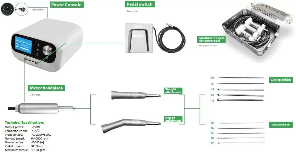 | Componentes incluidos | Diez puntas de rebabas, Un mango en ángulo, Un mango recto, Una caja de esterilización, un interruptor de pedal y una caja de aleación de aluminio, Una unidad principal y un controlador de potencia digitalizado (consola) |
