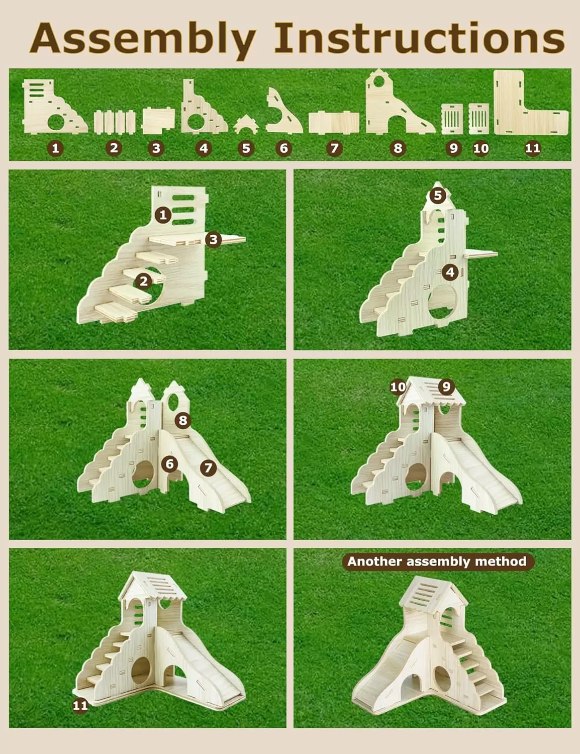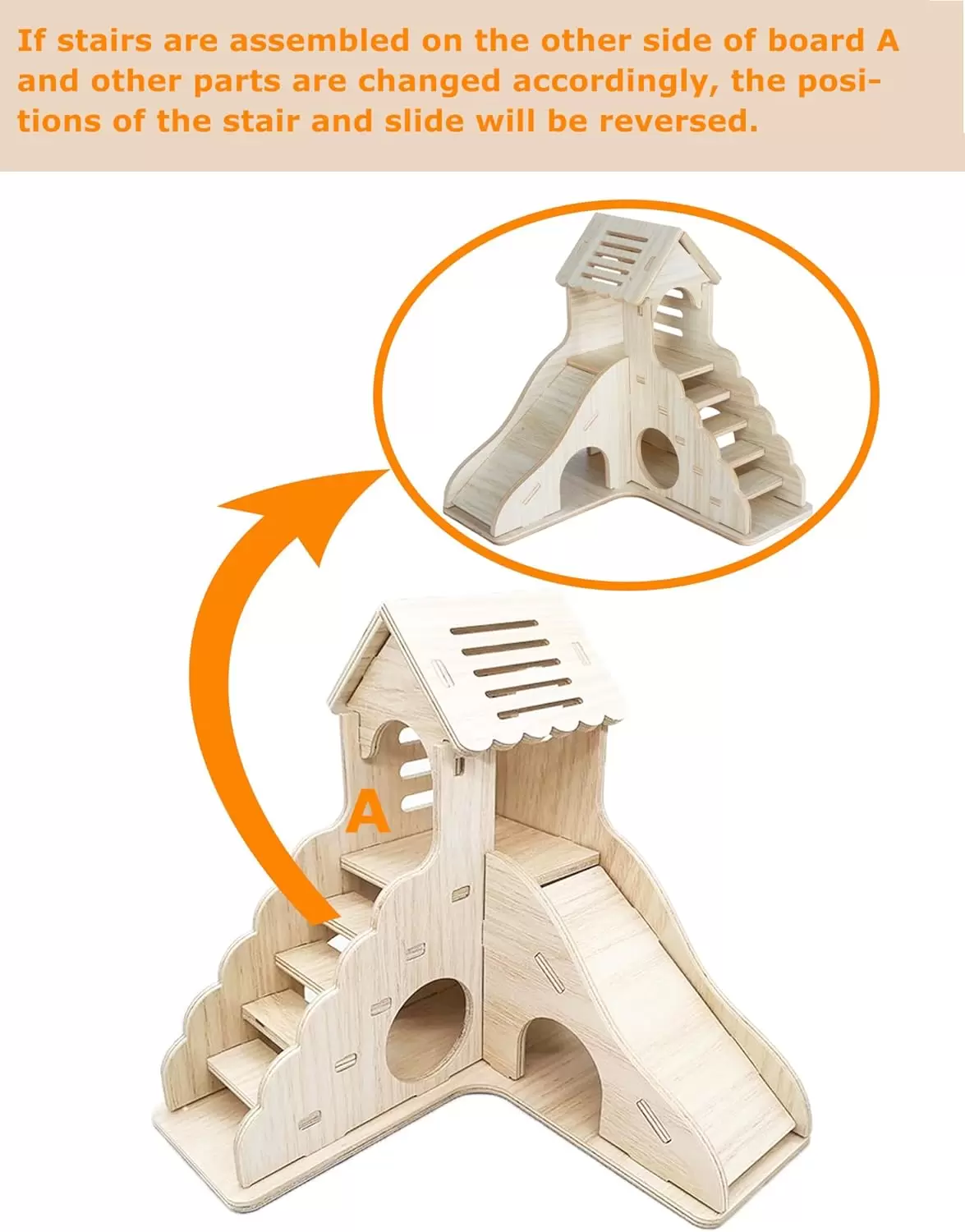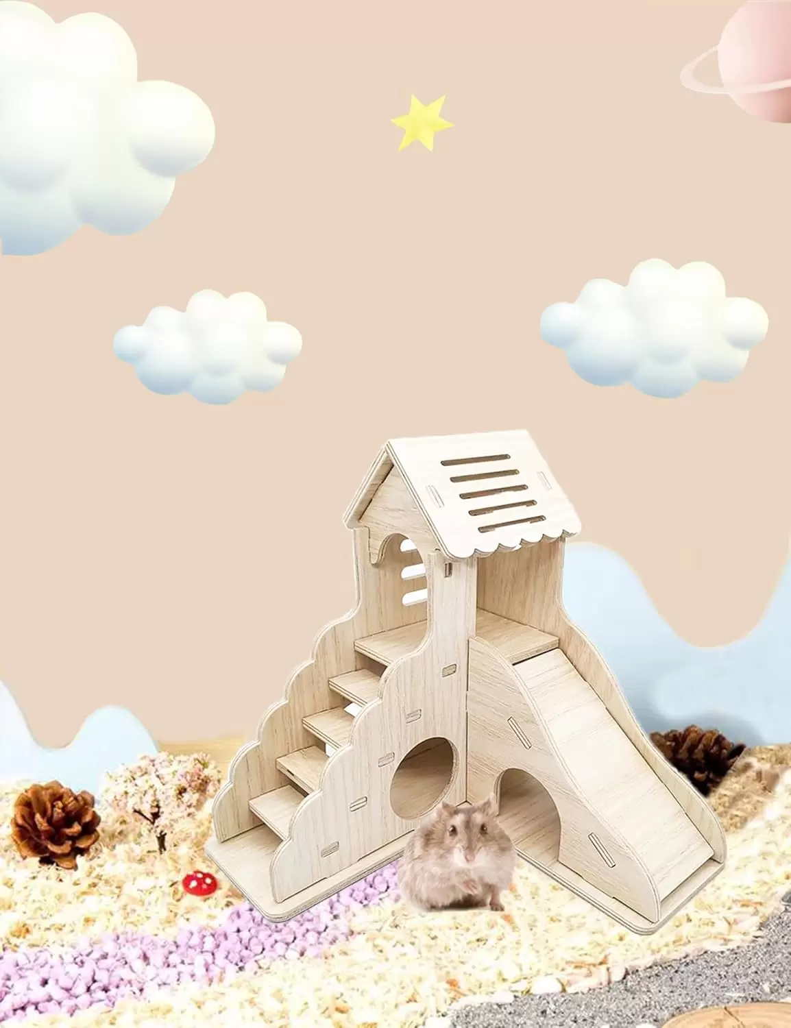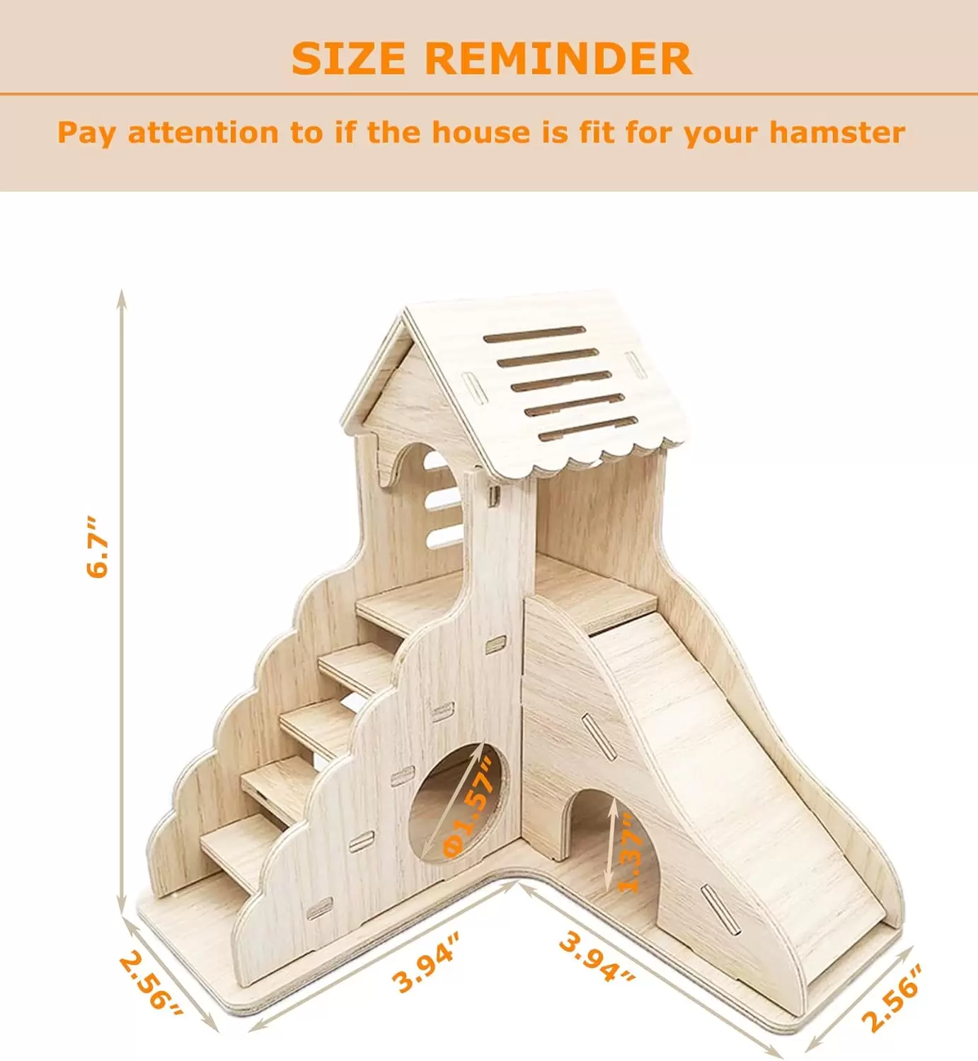 Escondite divertido: Este hábitat de hámster tiene varios espacios secretos, agujeros una pequeña escalera y un tobogán, proporcionan un área de juegos para que el ratón se esconda, almacene comida, trepe y juegue, el espacio es propicio para dormir durante el día. Esta cabaña satisface su instinto de juego y ayuda a reducir su soledad y aburrimiento.