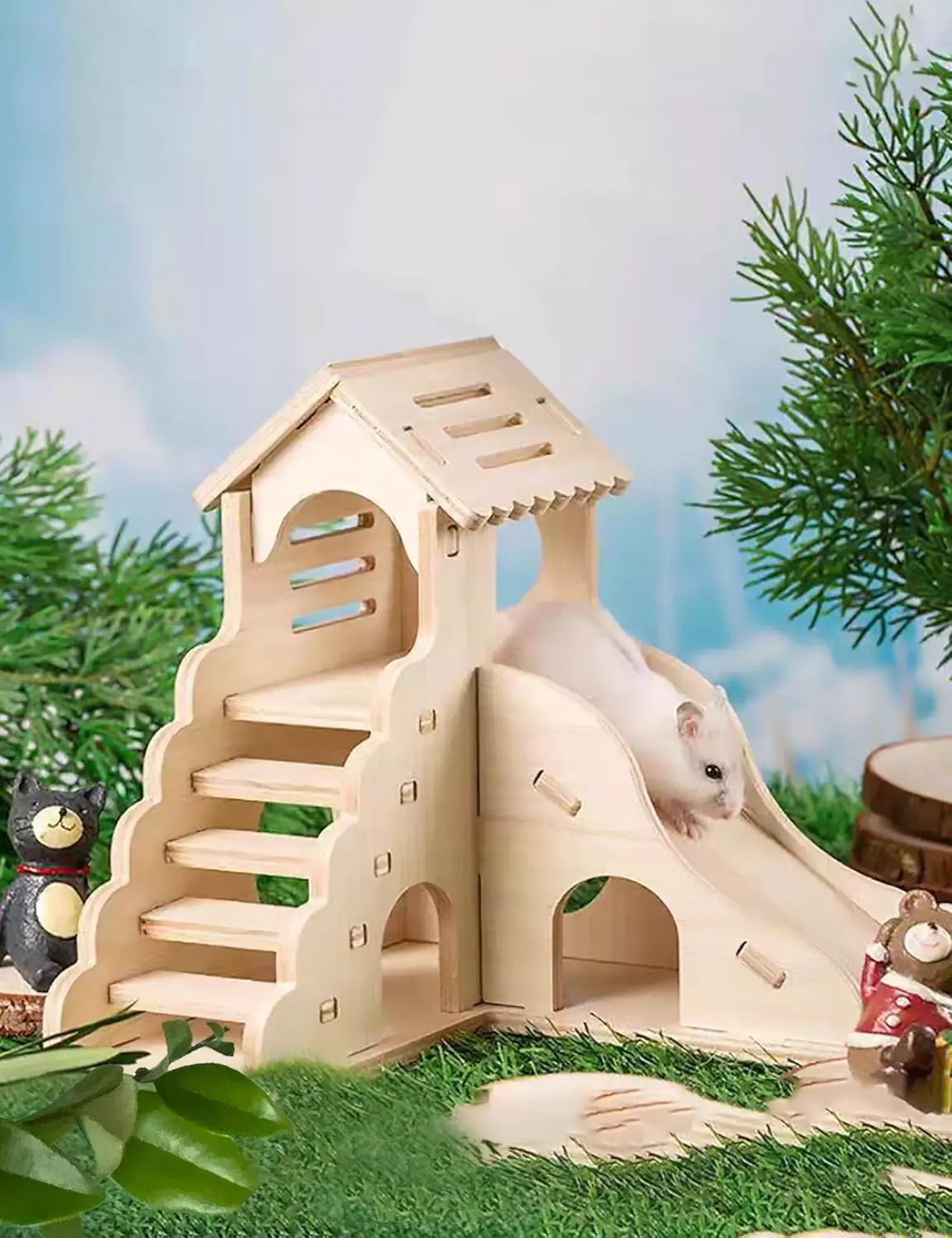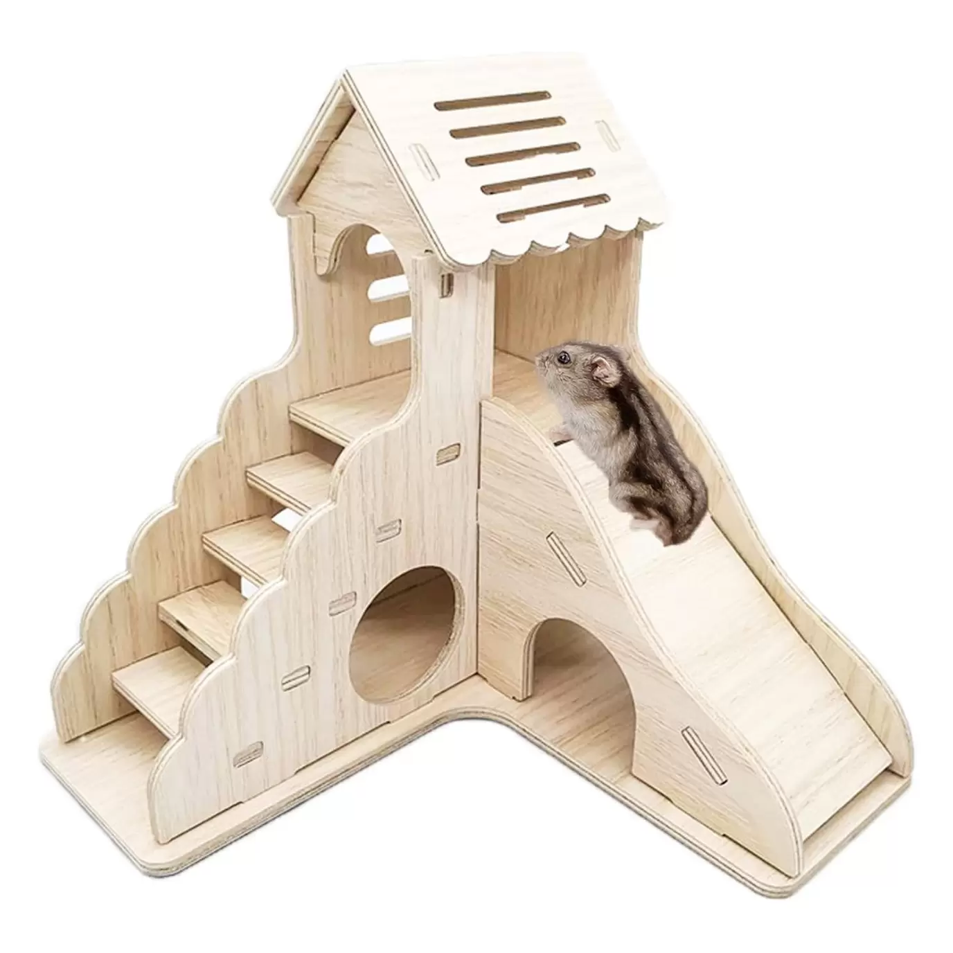 Mini Cabaña Laberinto 3-en-1 para Hámster (16.5×16.5×17 cm) | Escondite de Madera con Escalera y Tobogán Antiestrés