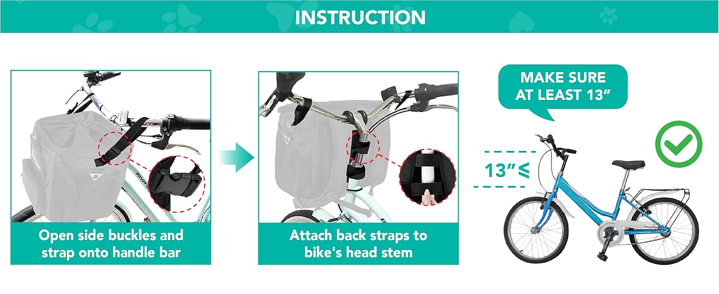 Portabicicletas ideal para tus mascotas: esta cesta de bicicleta mide aproximadamente 11 x 9 x 12 pulgadas (largo x ancho x alto) y está diseñada para acomodar perros, cachorros, gatos y gatitos. Tiene un límite de peso de hasta 18 libras, por lo que es adecuado para perros pequeños, pequeños y pequeños, y gatos medianos y grandes. Mide la longitud y la altura de tu mascota para garantizar un ajuste adecuado. Las instrucciones de instalación se pueden encontrar en las imágenes del listado. También es un gran regalo para papá perro, mamá, padres, dueños y entrenadores.