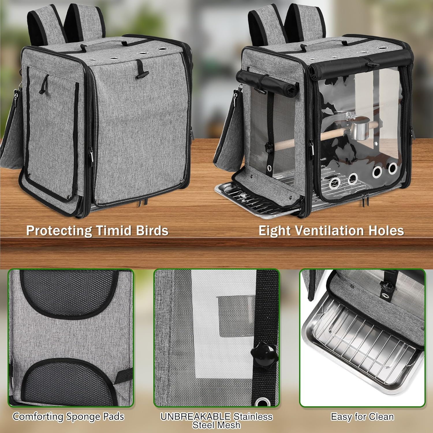 Apertura adicional en la parte inferior para una fácil limpieza: hemos diseñado una nueva apertura y cremallera en la parte inferior de la mochila transportadora de pájaros. Conveniente para limpiar la bandeja en cualquier momento. De esta manera, incluso para viajes de larga distancia, puede limpiar la bandeja y mantenerla limpia en cualquier momento sin desmontar la percha o sacar los pájaros.