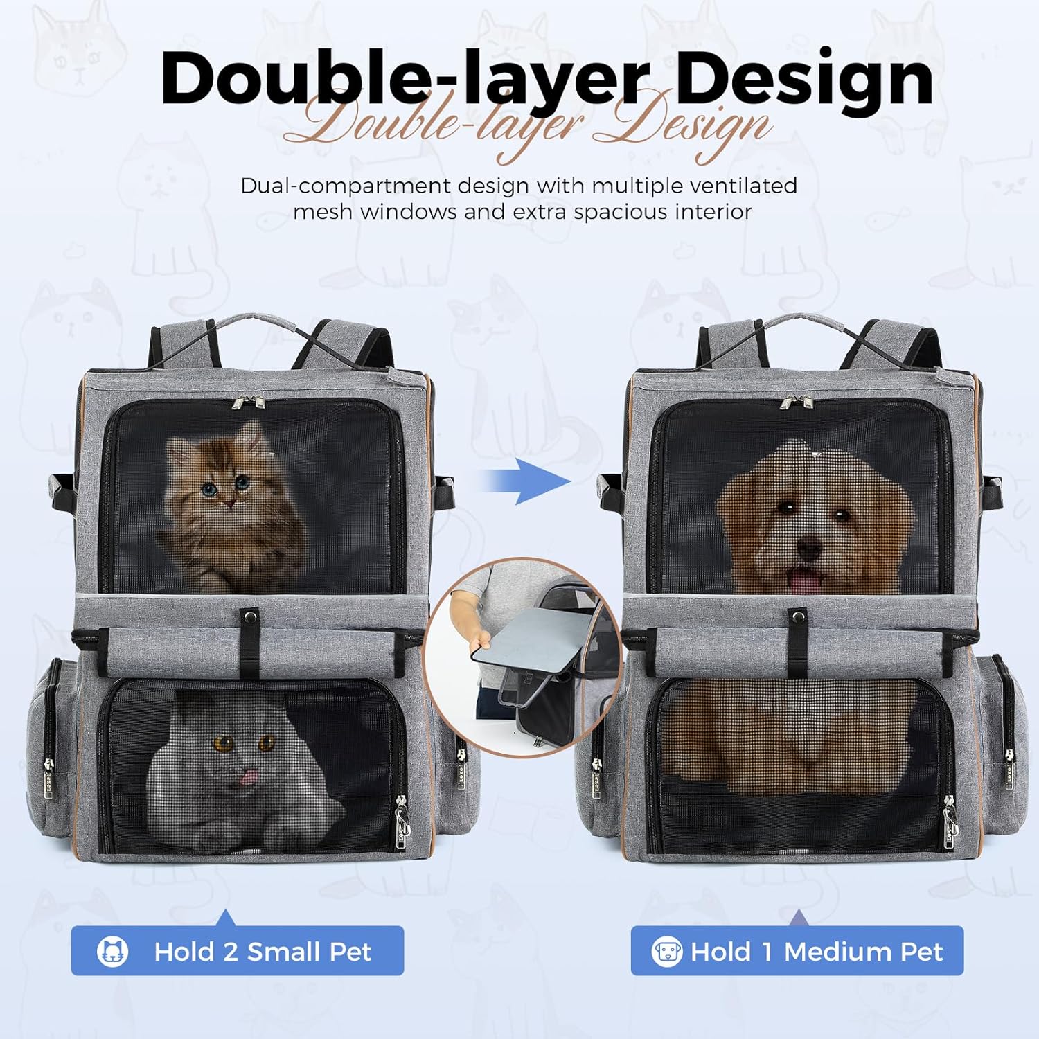 Transportador apto para mascotas: el transportador de mascotas de doble comparación cuenta con ventanas de malla alrededor para una excelente circulación de aire y visibilidad. Y las aberturas delanteras y medias permiten una fácil entrada para tu mascota