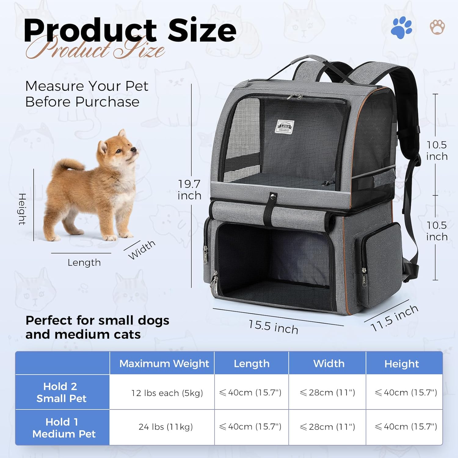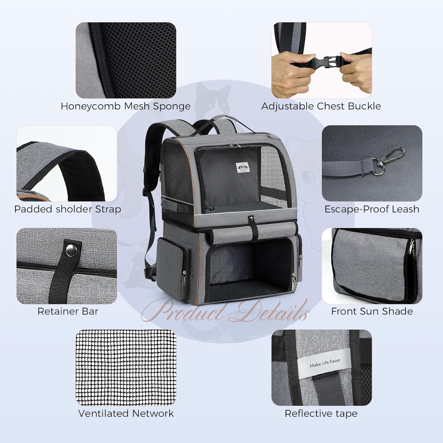 Compartimento doble: mide 15.74″x12.59″x19.69″, esta mochila de transporte para mascotas de dos niveles está diseñada con 2 compartimentos separados para 2 gatos pequeños/medianos (hasta 12 libras por cada compartimento) o una mascota más grande (hasta 24 libras). Esta mochila hace que sea mucho más fácil llevar varias mascotas pequeñas para actividades al aire libre
