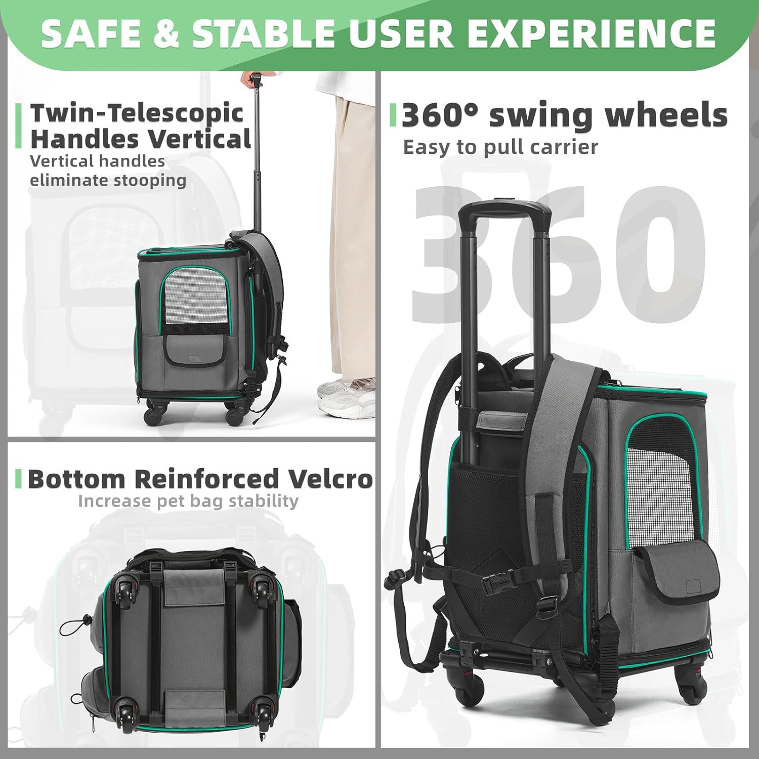 MOVILIDAD CONVENIENTE: el transportador para gatos con ruedas hace que transportar a tu mascota sea muy fácil. Experimentarás una caminata silenciosa y suave y una maniobrabilidad superior con la base de aluminio desmontable, el mango telescópico de doble barra de 4 niveles y las 4 ruedas extraíbles que giran 360 grados. Tu mascota consigue un paseo elegante y tiempo de calidad con un gran dueño.