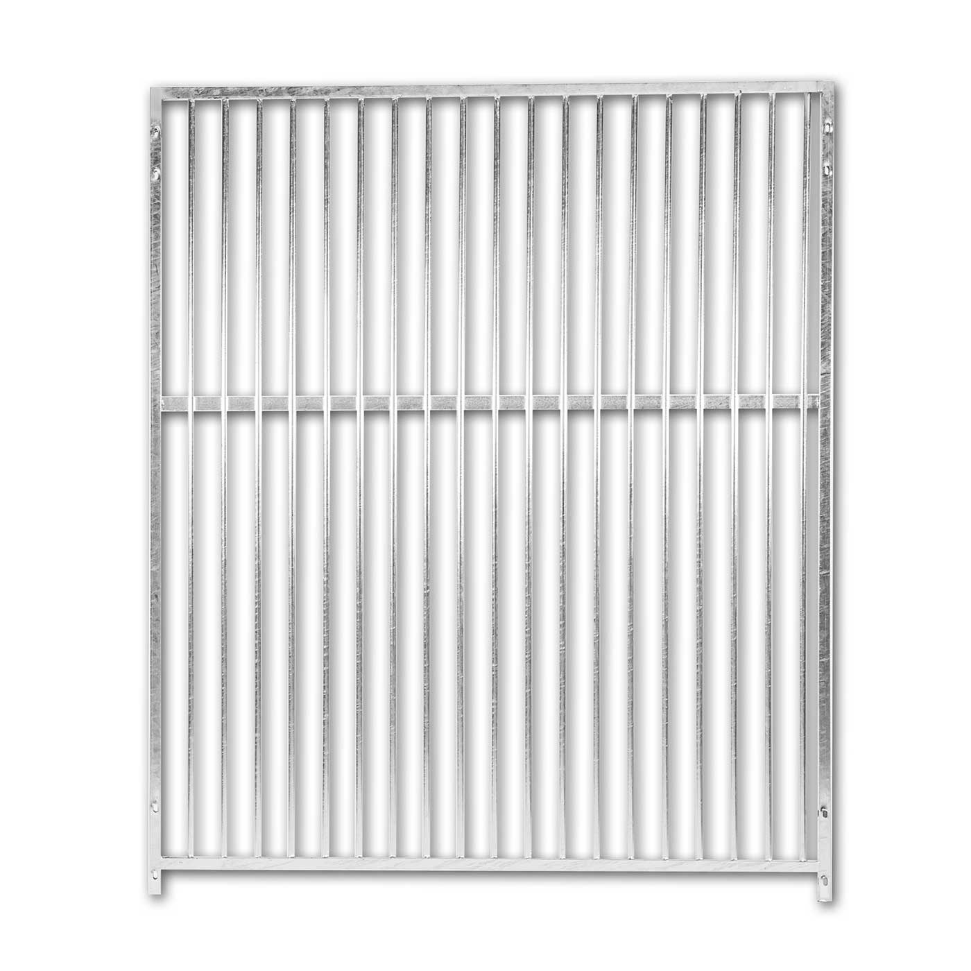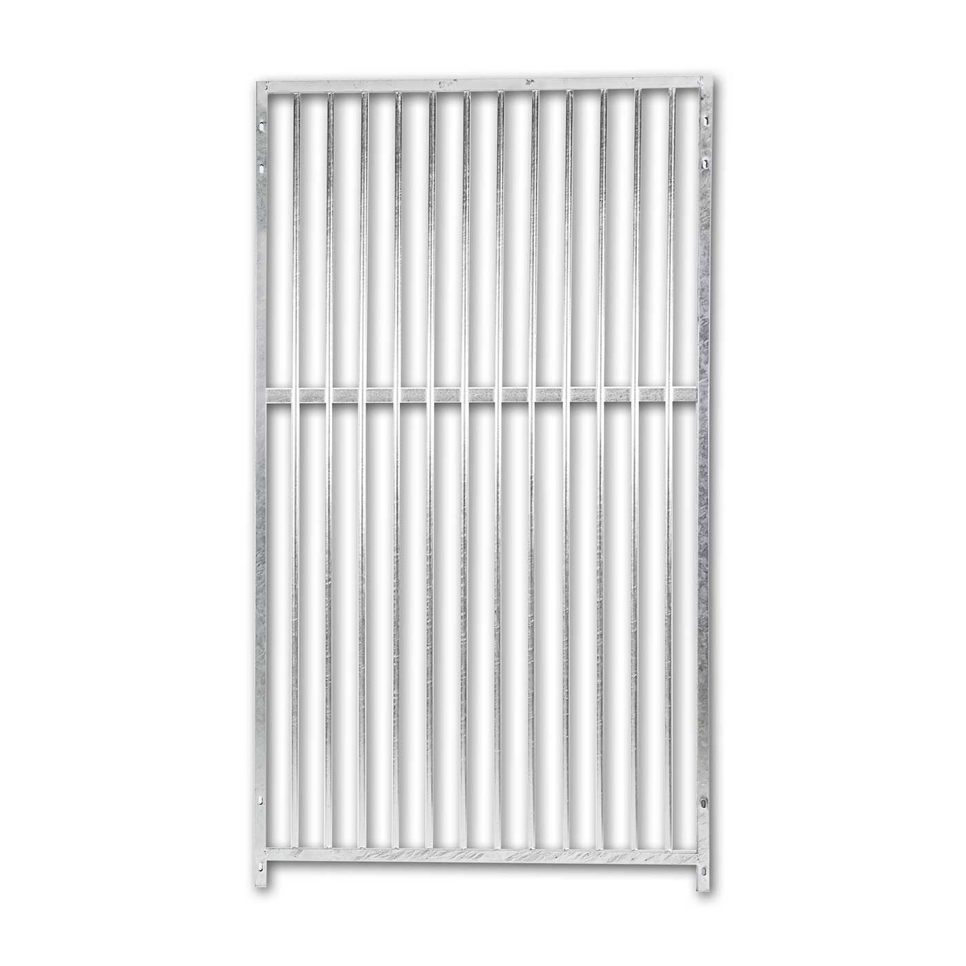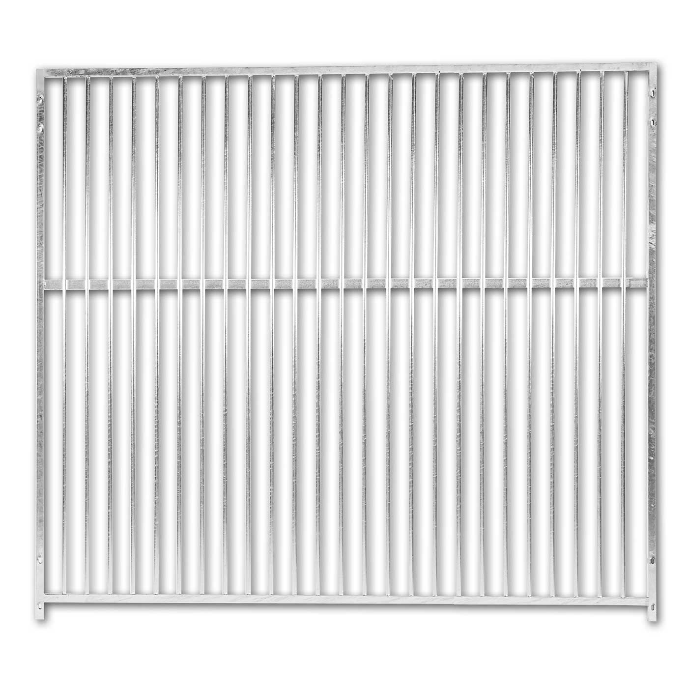 Panel modular compuesto por cerco de tubo 25/25 y barrote redondo de 16,separacion de barrote de 6 cm.; material galvanizado en caliente para evitar la corrosión y la oxidación. Posibilidad de unión lateral y transversal mediante agujeros oblongos, para librar desniveles.