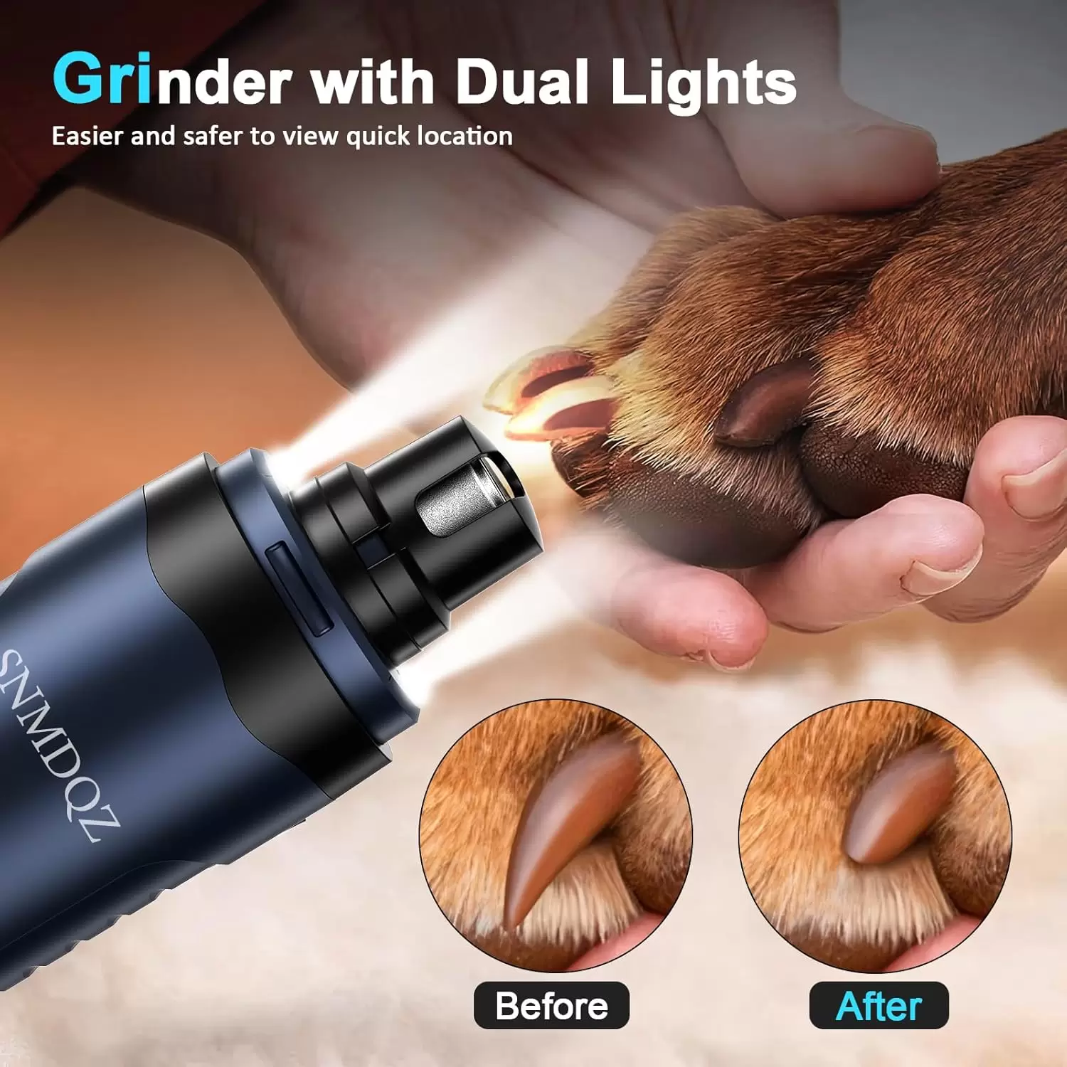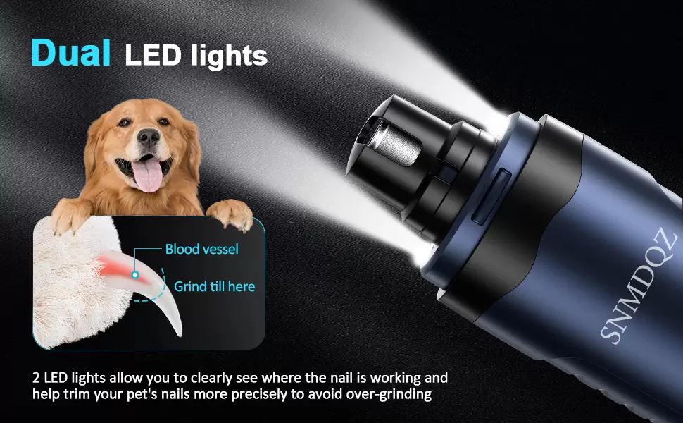 【2 luces LED y velocidad ajustable】- Nuestro afilador de uñas para perros cuenta con 2 luces LED que permiten ver claramente la posición de las uñas, especialmente en lugares oscuros. Esto le ayuda a recortar las uñas de su mascota y evitar lesiones accidentales. La velocidad ajustable (de 9000 a 12 000 RPM) se adapta fácilmente a las necesidades de corte de uñas de mascotas pequeñas, medianas y grandes.