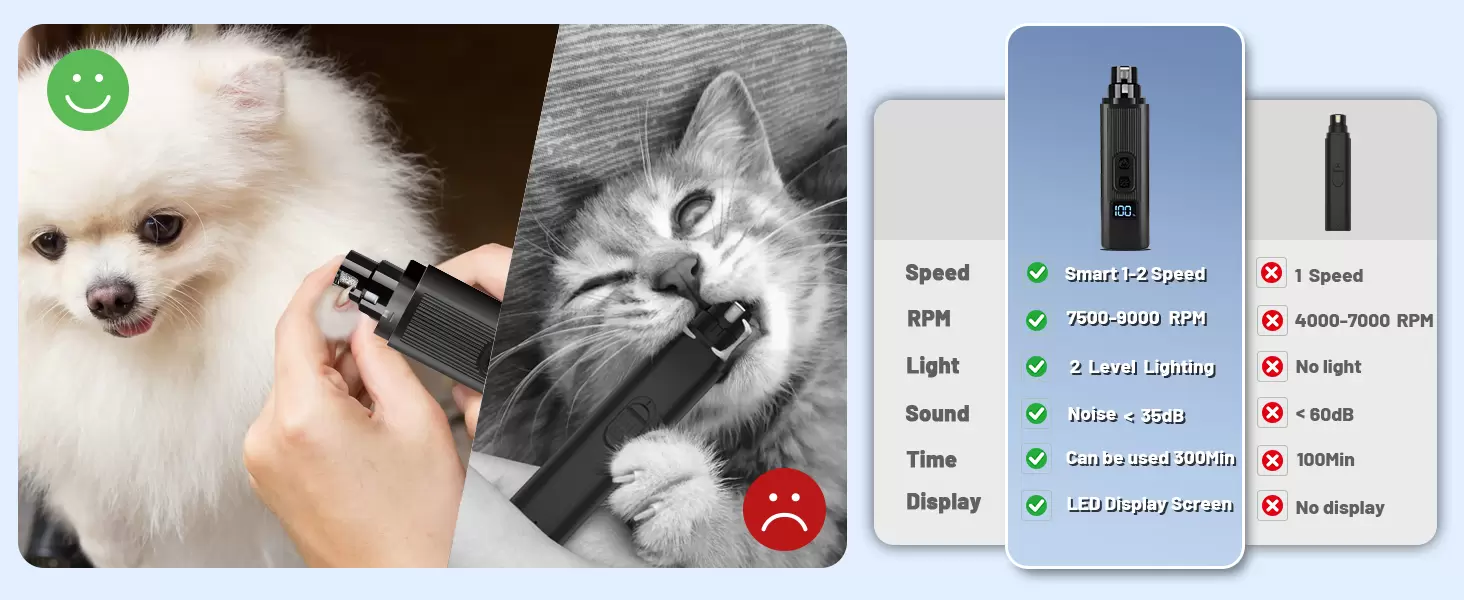 Diseño portátil y amigable para principiantes: hasta 4 horas de uso continuo para 1 hora de carga, y tiempo de espera de hasta 1 mes, lo que te proporciona servicios de uñas ininterrumpidos, lo que te permite cuidar las uñas de tu mascota en cualquier momento y en cualquier lugar, con una sensación cómoda que es fácil de sostener y operar