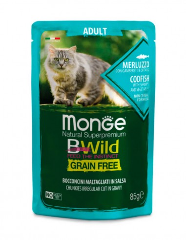 Esta Receta pertenece a la Gama Super Premium Bwild de la marca Italiana Monge. Ha sido formulada a partir de ingredientes 100% naturales: carne fresca de Bacalao combinada con camarones y zanahoria.