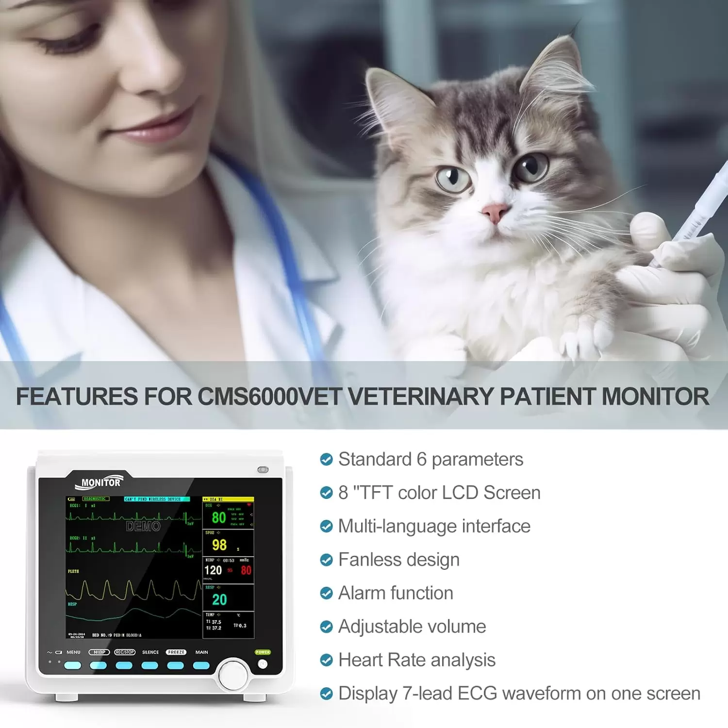 Monitor de Paciente Veterinario CMS6000VET | 6 Parámetros con Impresora para Clínicas y Mascotas