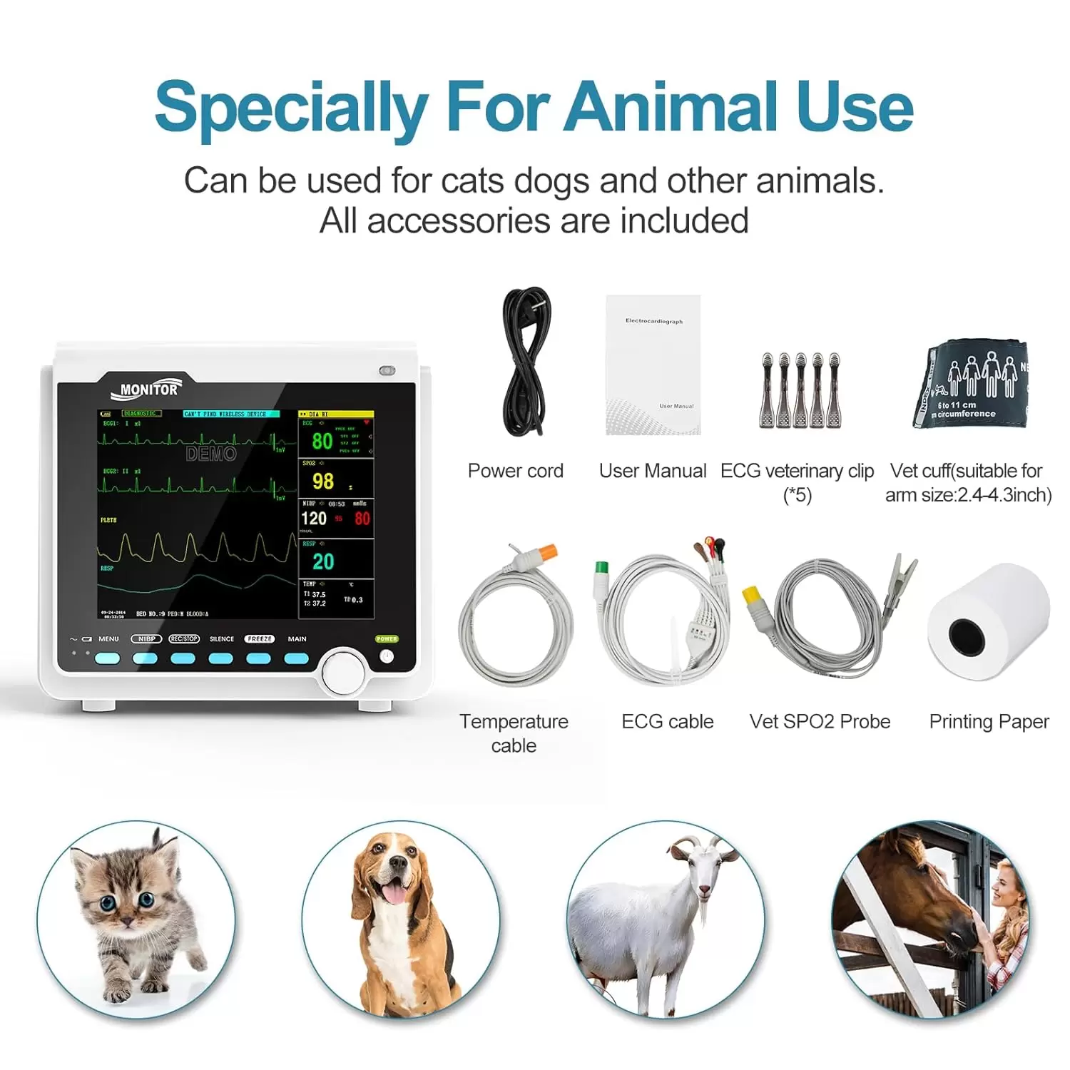 Lo que obtendrás en el paquete: una unidad principal CMS6000VET monitor de paciente, sensor SpO2 con clip de lengua veterinario digital BD7 (1 M), cable de extensión del sensor SpO2 digital general (2 M), cápsula neonatal de tubo único repetible (2.4-4.3 in), tubo de extensión NIBP, cable de plomo ECG de 5 derivaciones (estándar americano) ), ECG veterinario clip (*5), sonda TEMP transvaginal, impresora térmica, adaptador de corriente, cable de alimentación, manual de usuario (idioma español no garantizado).