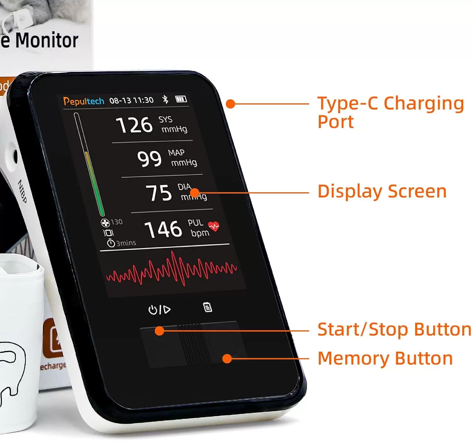 Monitor de presión arterial veterinaria recargable, con alta precisión y memoria de 1000 datos. Es ideal para clínicas, hospitales y uso familiar en todo Chile.