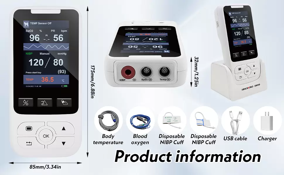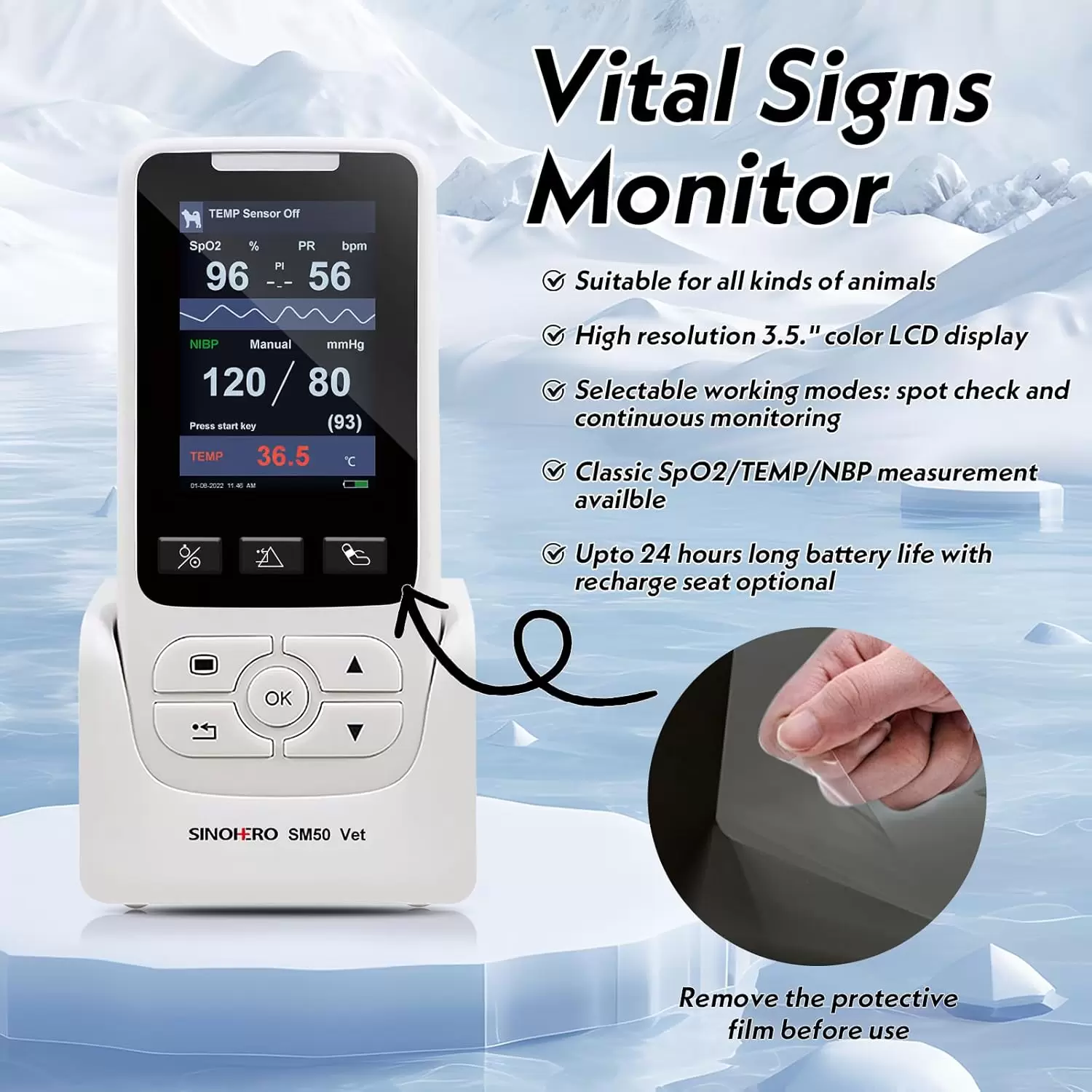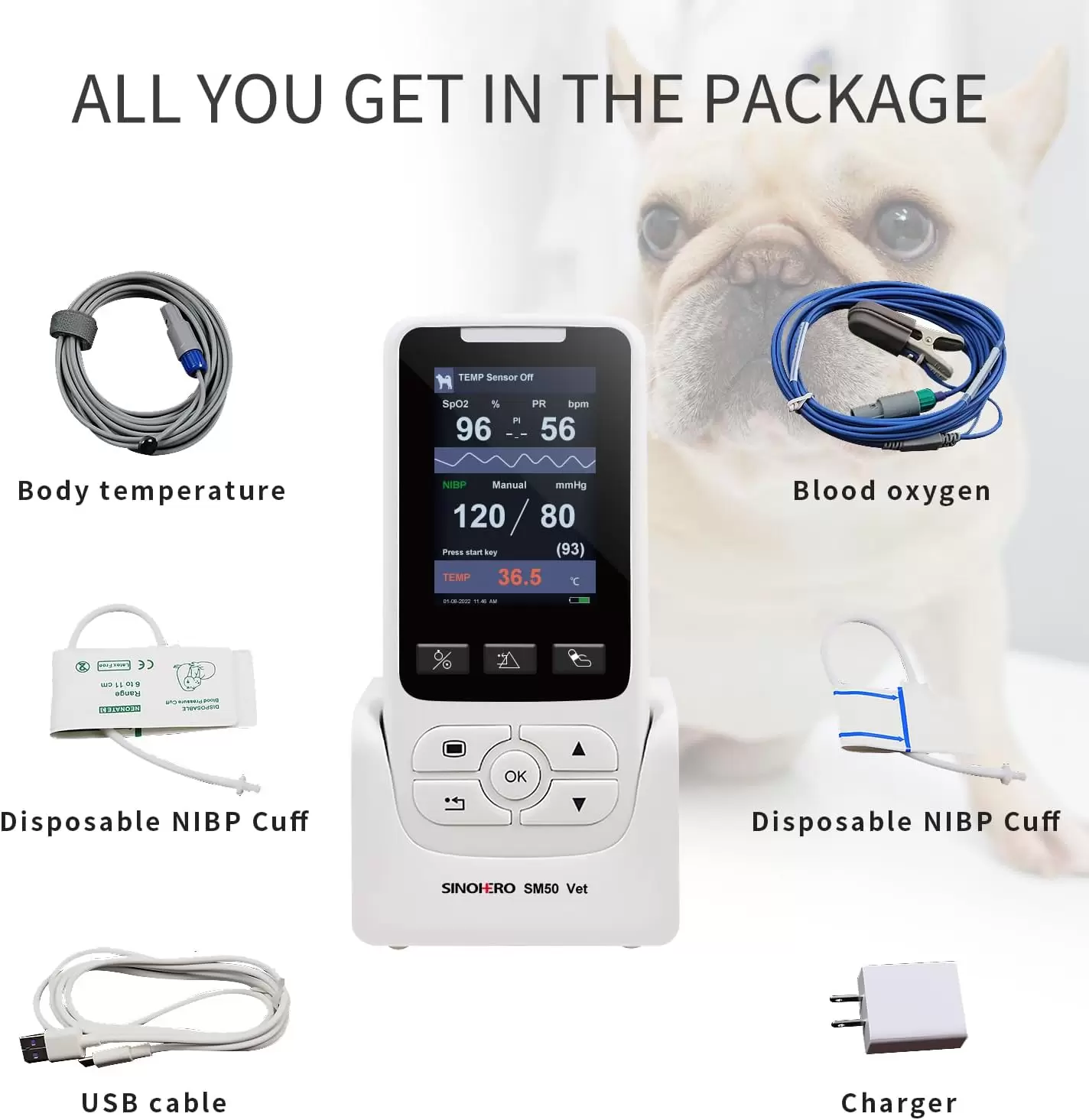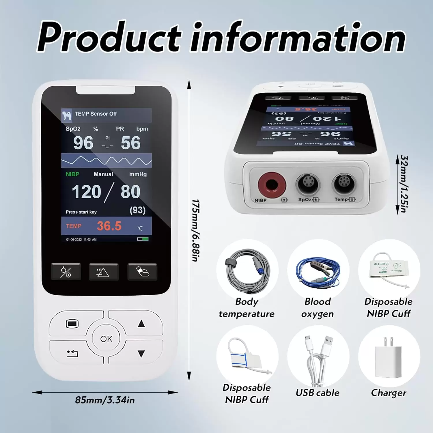 Precisión de grado veterinario: cuenta con una precisión de ± 2% SpO2 (70-100%), lecturas TEMP de ±0.35.6 °F y mediciones NIBP de ±5mmHg (método oscilométrico) en rangos personalizables específicos de animales. Incluye unidades seleccionables (°C/°F, mmHg/kPa) y puños de ajuste automático (rango de presión de 0 a 300 mmHg).