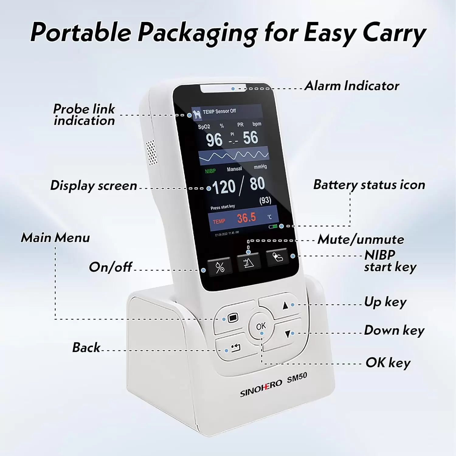 Diseño para uso durante todo el día: construido para la eficiencia en el punto de atención, su diseño ligero (9.88 oz – 13.05 oz) y la interfaz intuitiva de 8 botones garantizan un funcionamiento sin esfuerzo. Elige entre modos de control puntual o monitoreo continuo para adaptarse a cualquier flujo de trabajo, desde triaje de emergencia hasta atención a largo plazo.