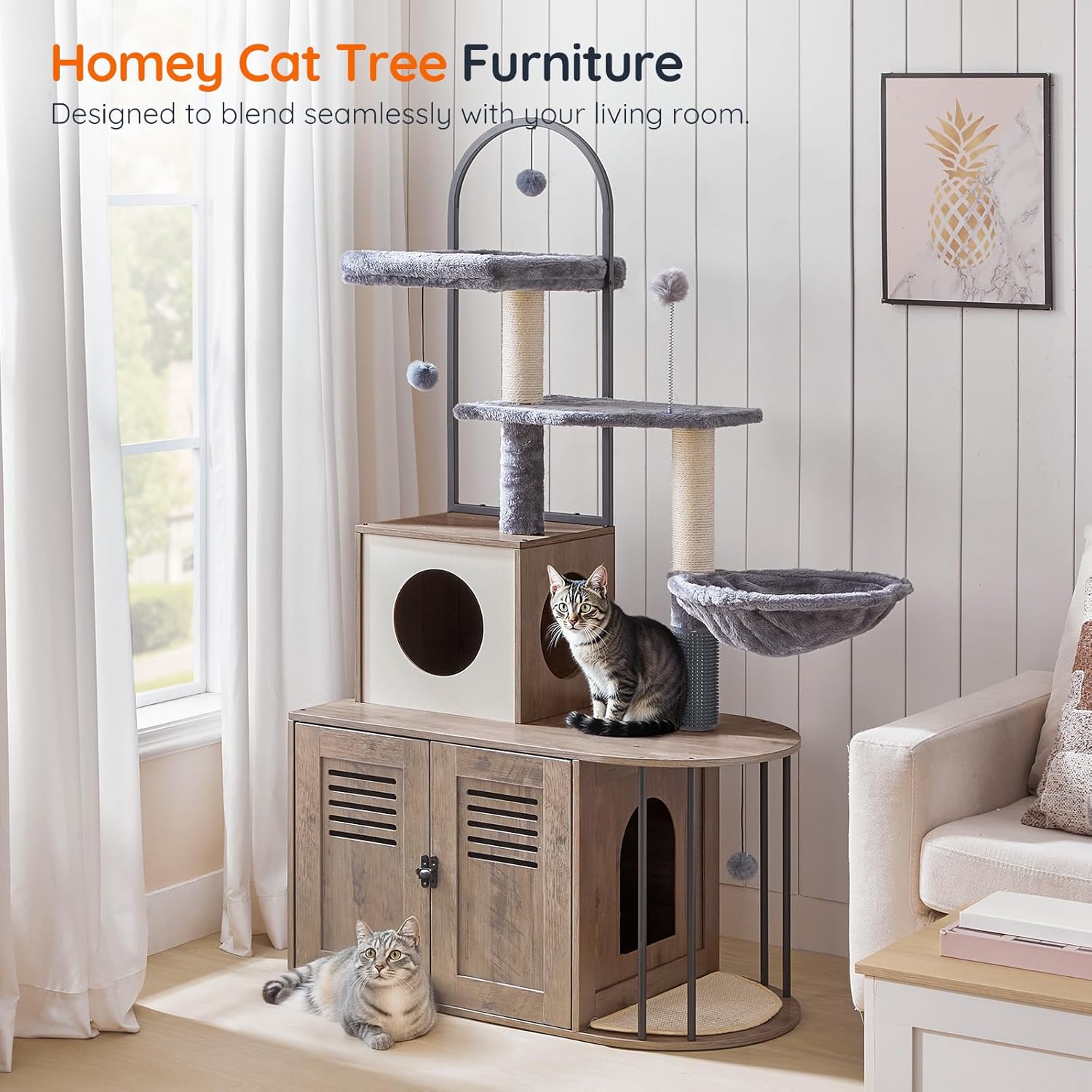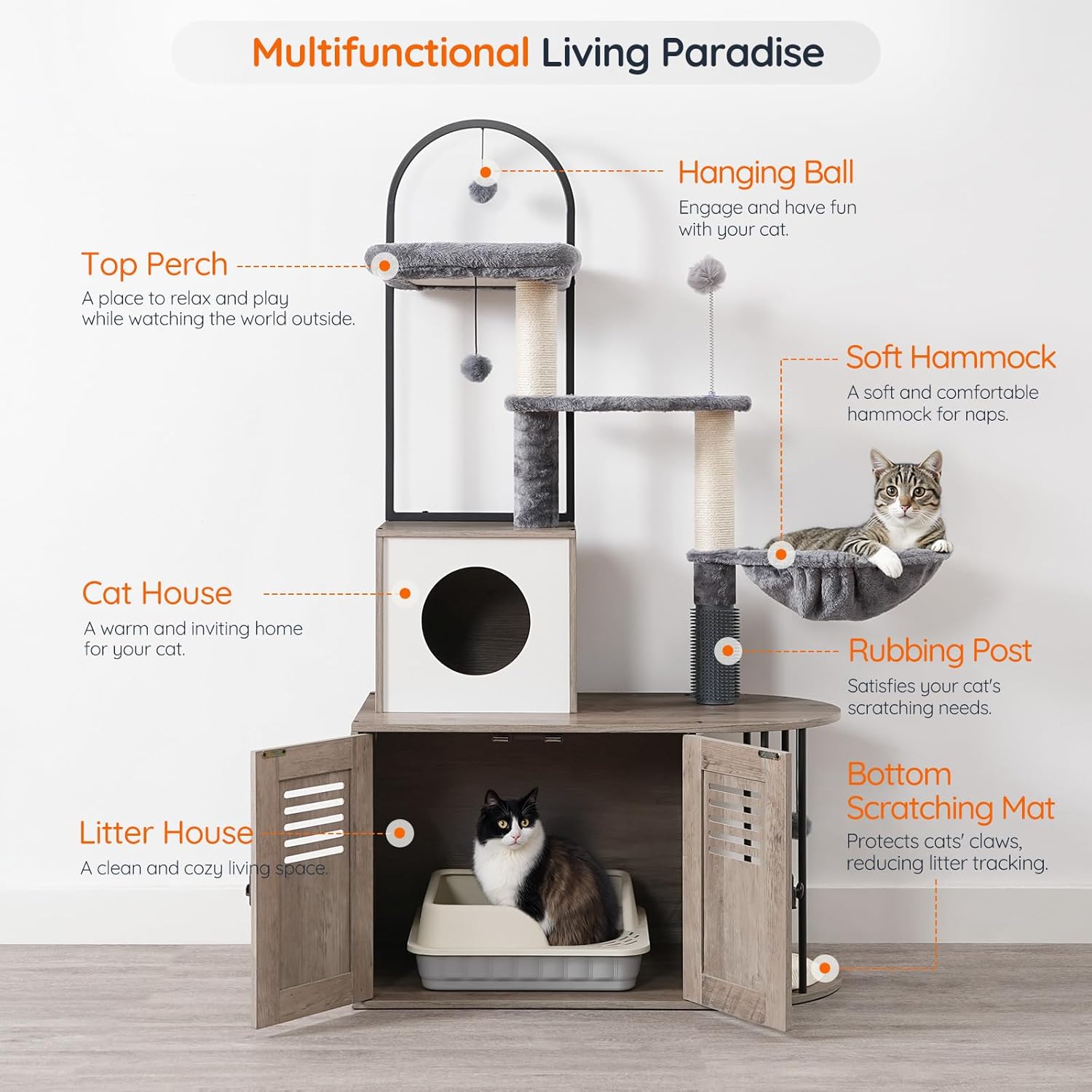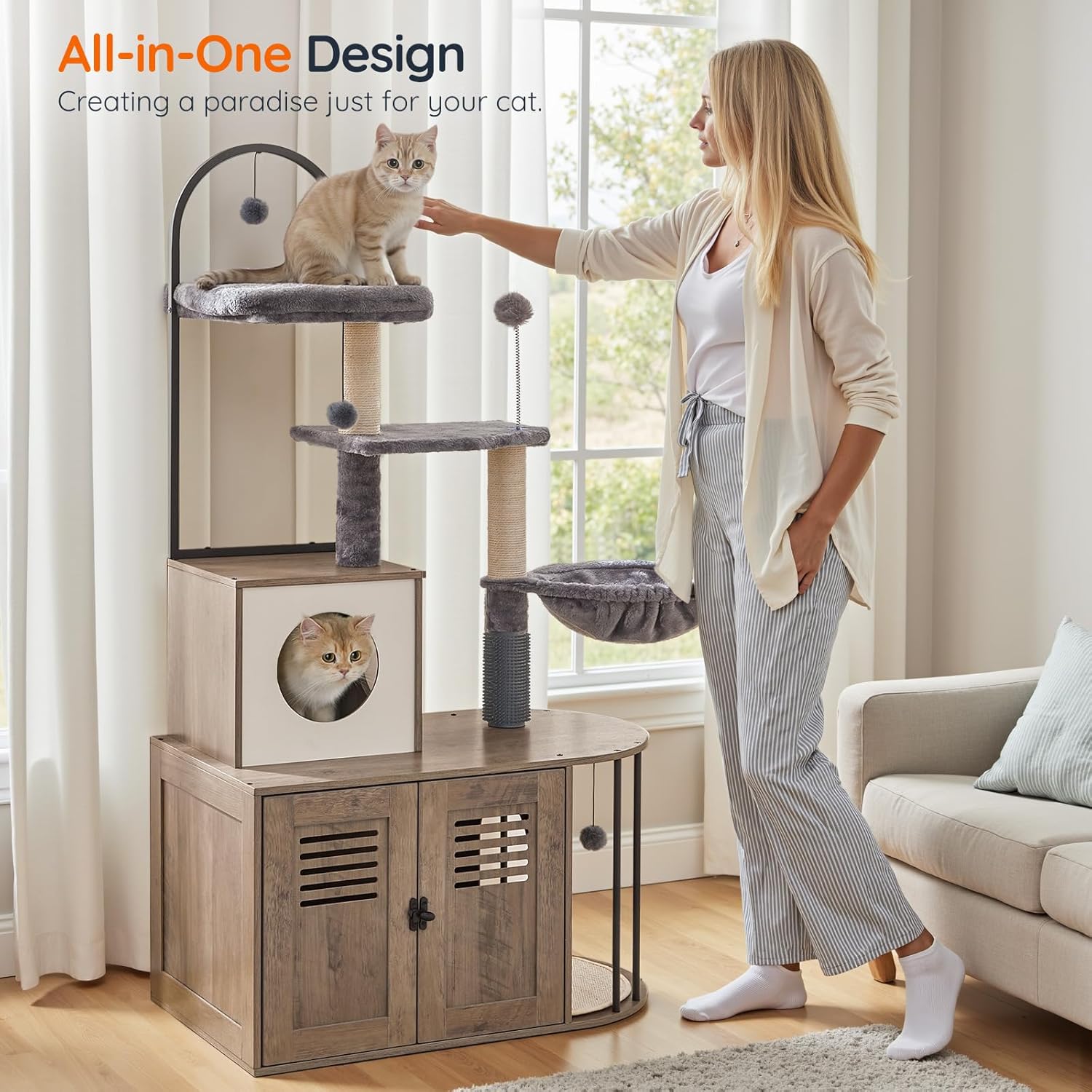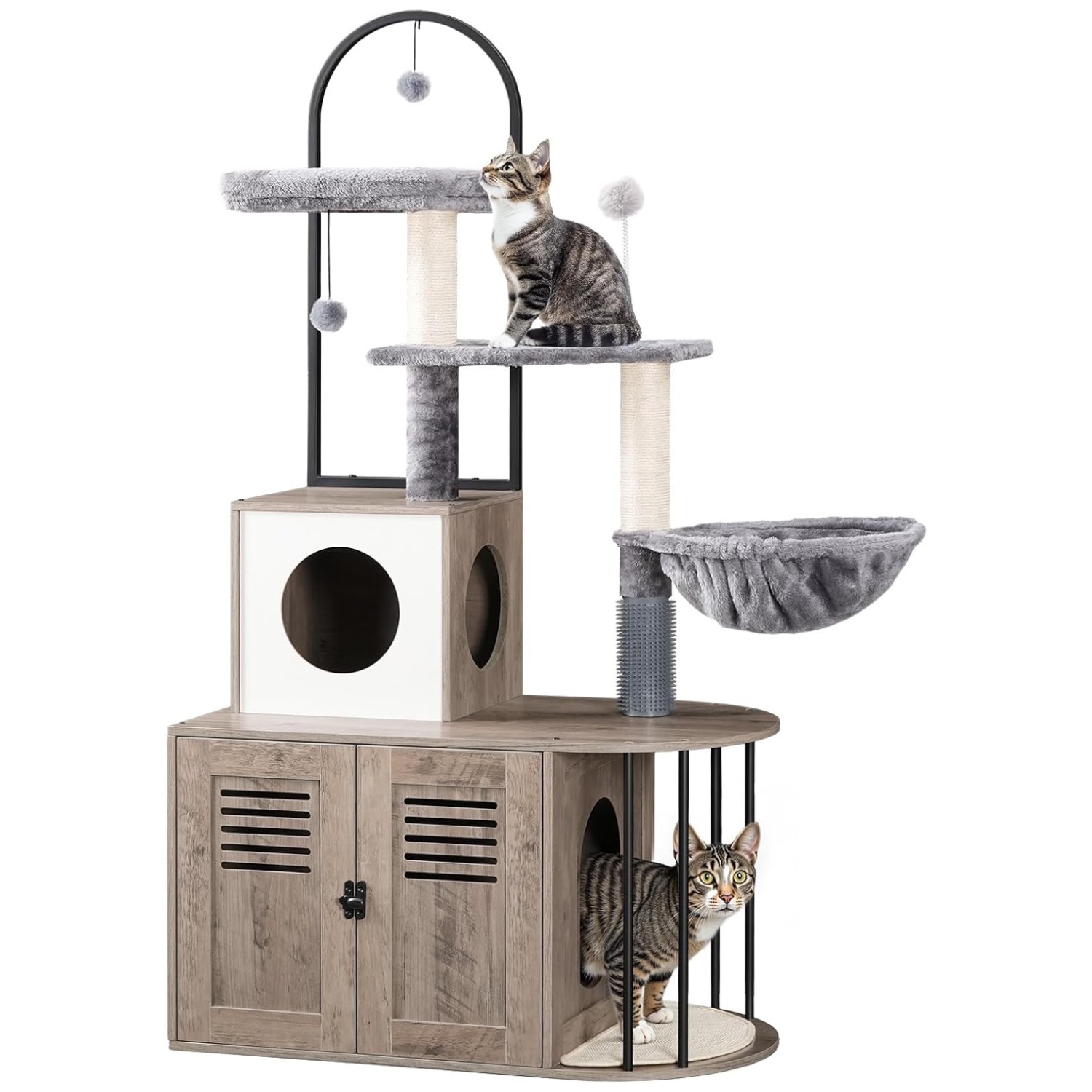 Mueble Rascador con Arenero Interior + Condominio y Hamaca para Gatos 45x80x145