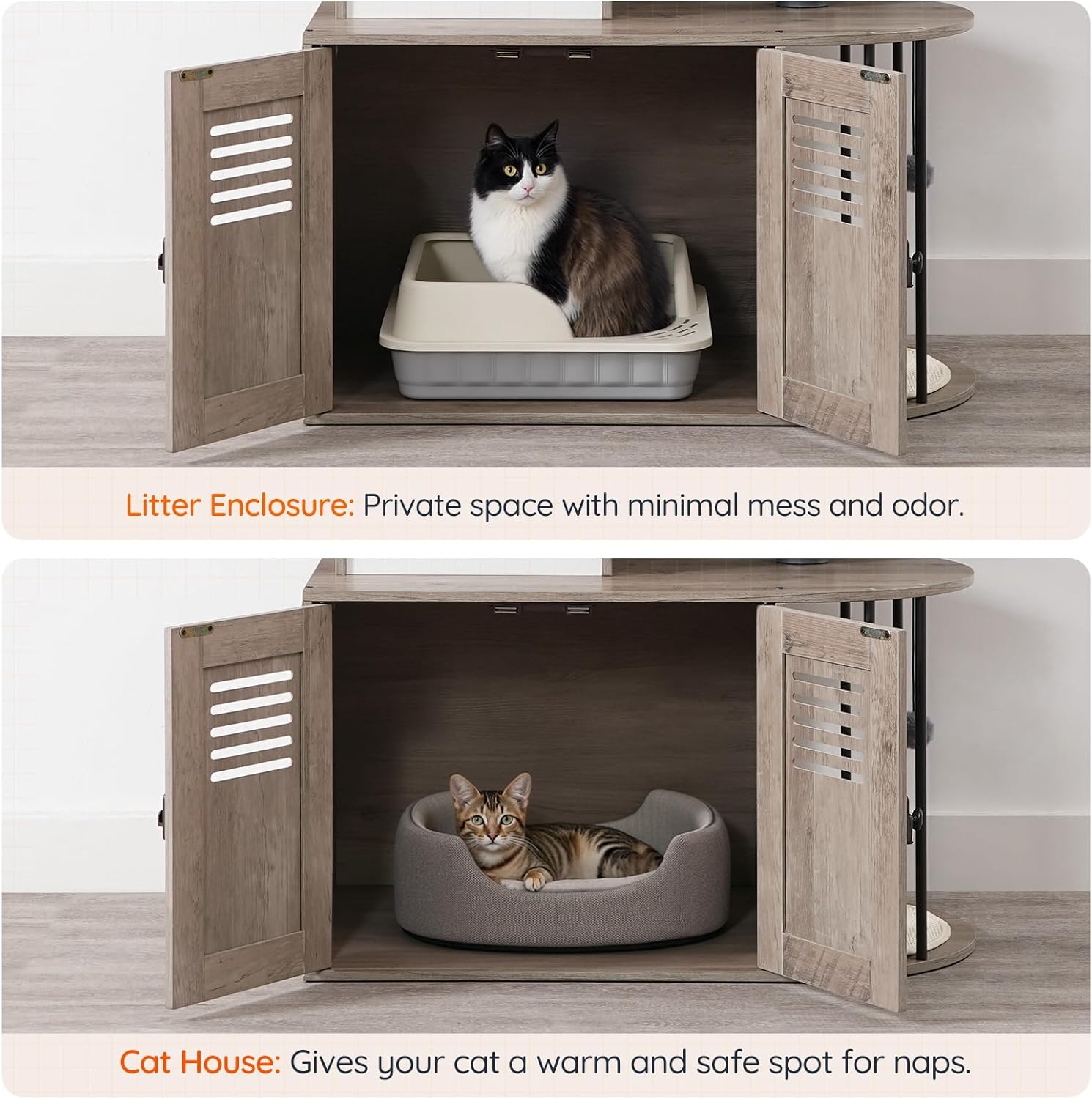 Casa de arena oculta y práctica alfombrilla de sisal: la casa de arena de 31.5 pulgadas de largo x 17.7 pulgadas de ancho x 57 pulgadas de alto protege la privacidad de tu gato. Una práctica alfombrilla de sisal en la entrada atrapa la dispersión de basura y sirve como rascador, asegurando una visita al baño limpia y acogedora para tu gato