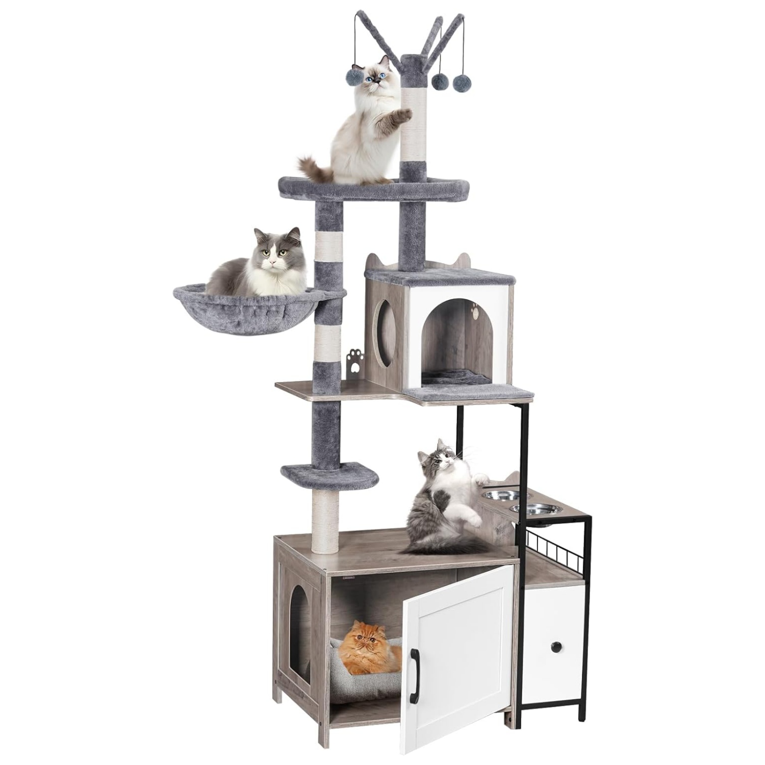 Mueble Rascador con Arenero Interior + Estación de Alimentos Elevada para Gatos 71x45x171 Cm