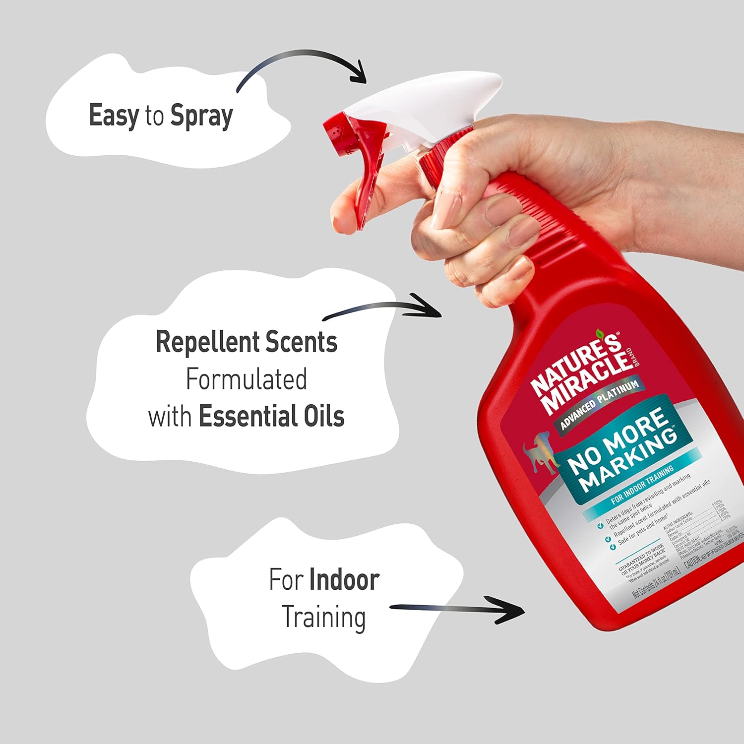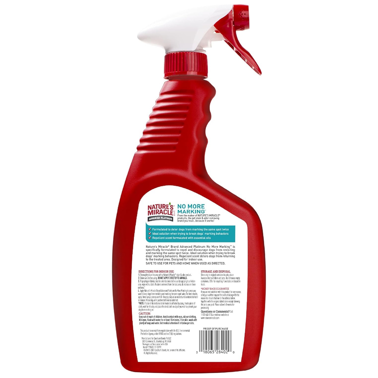 Nature’s Miracle® Los quitamanchas y olores de mascotas han sido una marca de confianza para la limpieza del desorden de mascotas durante 40 años. Los quitamanchas y olores de Nature’s Miracle son desinfectantes de virus, ayudas de entrenamiento, gestión de basura y desechos y productos de aseo ofrecen soluciones para la vida con mascotas, desde el desorden diario hasta los trabajos de limpieza más difíciles. Independientemente de lo que hagan las mascotas, puedes confiar en los productos Nature’s Miracle para deshacer. Nature’s Miracle® Advanced Platinum No More Marking ayuda a evitar que los perros vuelvan a visitar y marcar el mismo lugar dos veces. Este producto es ideal para usar durante el entrenamiento en interiores cuando se intenta romper los comportamientos de marcado de los perros. Aroma repelente formulado con aceites esenciales y disuade a los perros de regresar a la zona tratada. Seguro para usar alrededor de mascotas y hogar cuando se utiliza como se indica. Antes de usar, limpia a fondo el área con un producto Nature’s Miracle Stain and Odor Product. Agitar bien antes de usar. No aplicar directamente a mascotas. Para usar, aplique Nature’s Miracle Advanced Platinum No More Marking en las áreas en las que desea evitar que los perros vuelvan a visitar y marquen el mismo lugar dos veces. Para obtener los mejores resultados, aplique 3 aerosoles por pie cuadrado. Vuelva a aplicar diariamente o según sea necesario hasta que se rompa el hábito indeseable, elogie al perro cuando se exhiba un comportamiento positivo. Consulte la etiqueta para obtener instrucciones de uso completas. Seguro para mascotas y hogar cuando se utiliza como se indica.