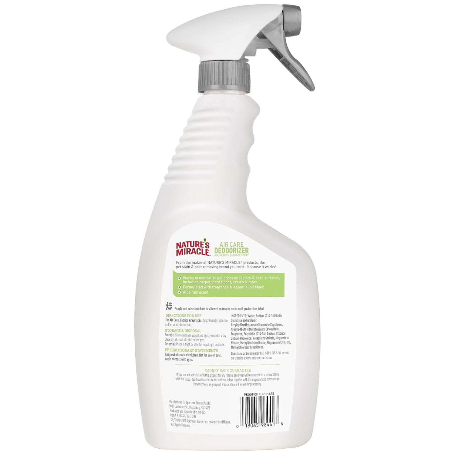 Nature’s Miracle® Los quitamanchas y olores de mascotas han sido una marca de confianza para la limpieza del desorden de mascotas durante 40 años. Los quitamanchas y olores de Nature’s Miracle son desinfectantes de virus, ayudas de entrenamiento, gestión de basura y desechos y productos de aseo ofrecen soluciones para la vida con mascotas, desde el desorden diario hasta los trabajos de limpieza más difíciles. Independientemente de lo que hagan las mascotas, puedes confiar en los productos Nature’s Miracle para deshacer. A veces, tener mascotas significa olores no deseados que persisten en su hogar. Cuando las cosas empiezan a tener olor, Nature’s Miracle® Air Care Deodorizer trabaja para neutralizar los olores de las mascotas en telas y superficies duras, incluyendo alfombras, suelos duros, cajas y más. A diferencia de muchos productos que simplemente pueden enmascarar los olores desagradables de las mascotas, esta solución para controlar olores de mascotas funciona para descomponer y ayudar a destruir los olores difíciles de las mascotas al contacto. Además, está formulado con una mezcla de fragancias que contiene aceites esenciales para dejar un agradable aroma a lluvia de aloe. Rocíe en el aire o en superficies para ayudar a neutralizar los olores de las mascotas en telas y superficies duras, incluyendo alfombras, suelos duros, cajas y más espacios en toda la casa. Seguro para mascotas y el hogar cuando se utiliza y almacena según las indicaciones.