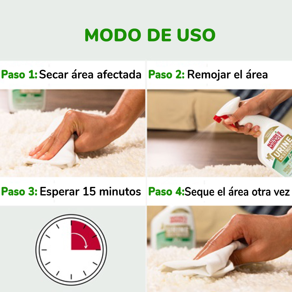 El Limpiador Nature’s Miracle Destructor de orina Plus para gatos está listo para usar en cualquier momento, se puede utilizar en alfombras, pisos de madera, pisos de vinil, pisos laminados, cerámica pulida, muebles, telas y más. Vierte el Limpiador Nature’s Miracle Destructor de orina Plus en el área afectada, déjalo reposar durante 15 minutos y luego seca con un paño limpio. Además, es seguro para las mascotas y el hogar.