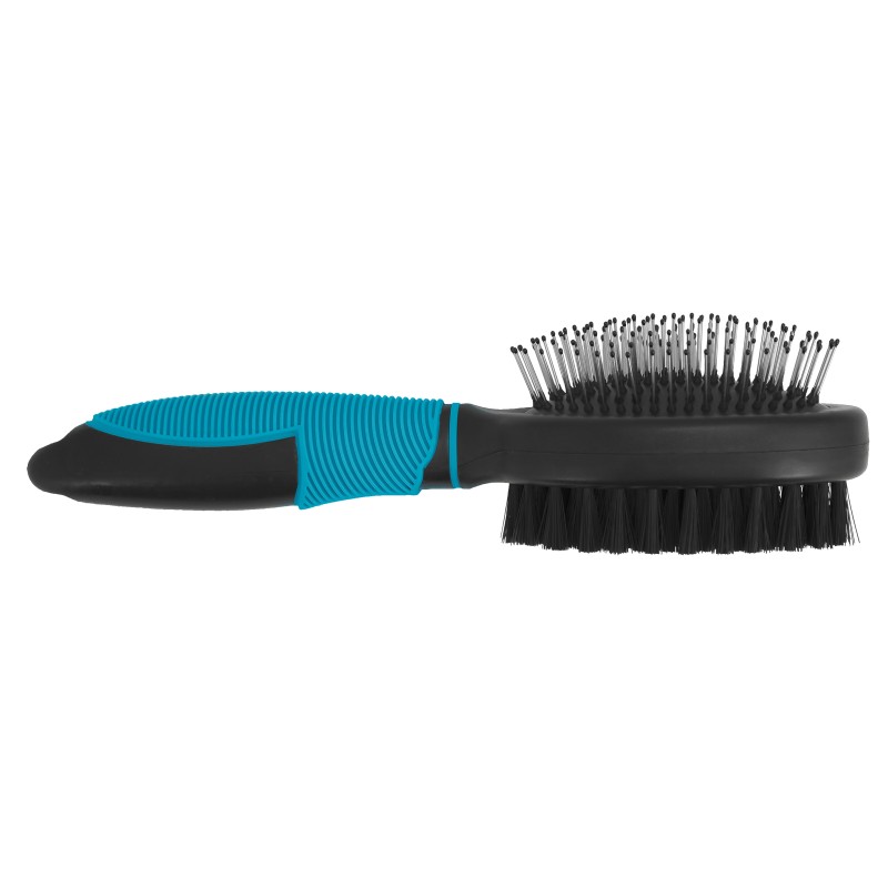 Cepillo doble con forma ovalada, ésta evita que podamos dañar a nuestra mascota durante el cepillado de zonas delicadas como por ejemplo los ojos. Las púas del cepillo acaban en forma redondeada para no dañar la piel de nuestra mascota y que el cepillado sea un momento placentero para ella. Mango ergonómico para mayor comodidad. Ayuda a quitar nudos y deja un pelaje libre de polvo, todo un acabado profesional. Apto para perro y gato. Disponible en dos tamaños.