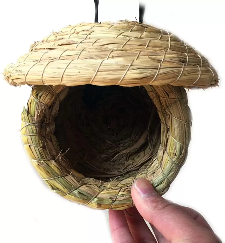 Una cabaña de hierba natural para pájaros, tejida a mano para anidar. Su diseño de bolsillo colgante es perfecto para que los colibríes y aves pequeñas se resguarden y descansen.