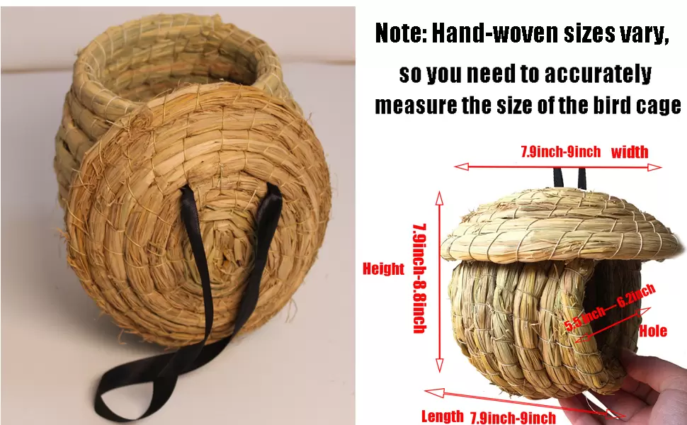 El paquete incluye: 2 casas para pájaros de paja, tamaño del producto de aproximadamente 7.9-9 pulgadas de largo, 7.9-9 pulgadas de ancho y 7.9-8.8 pulgadas de alto. Tamaño del agujero: 5.5-6.2 pulgadas