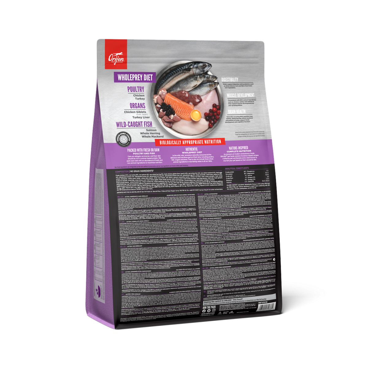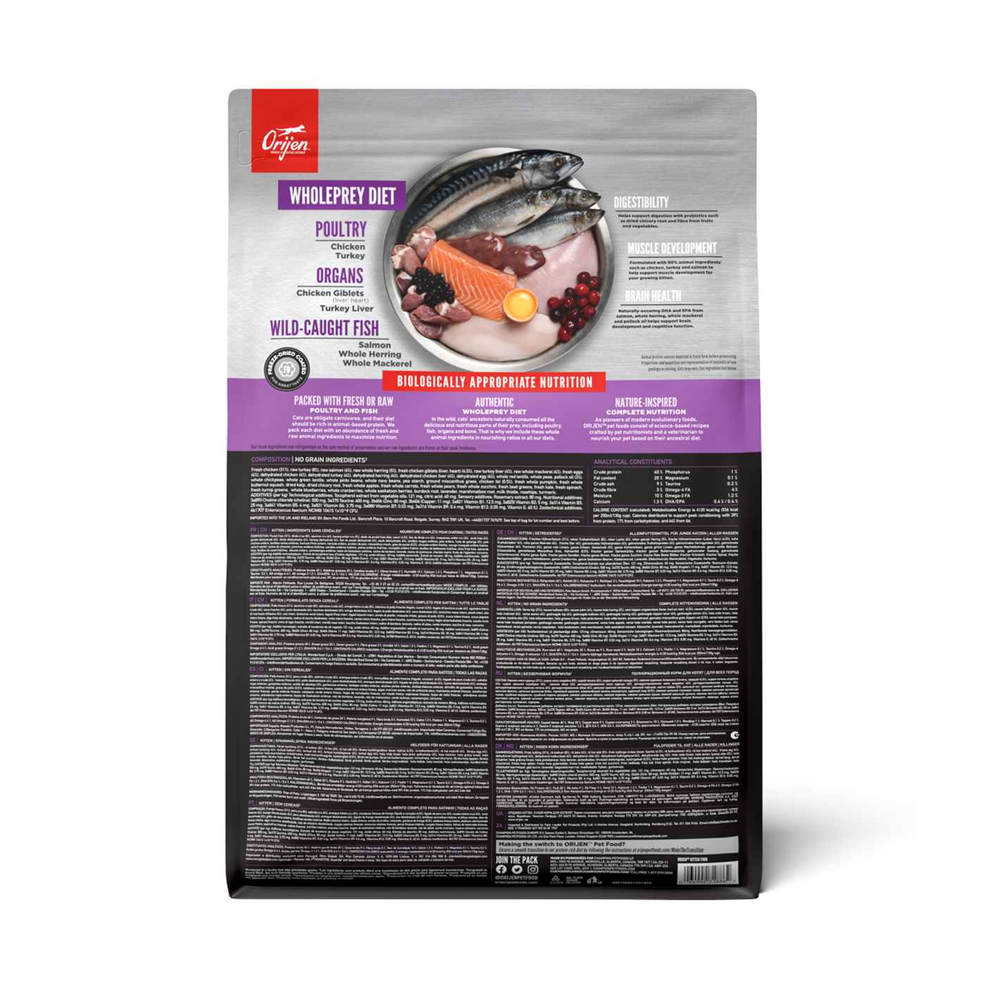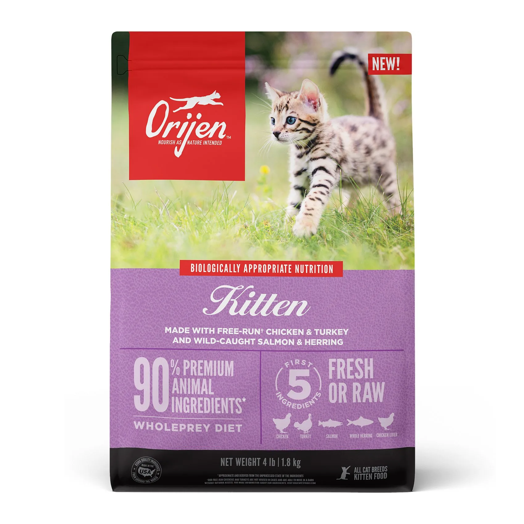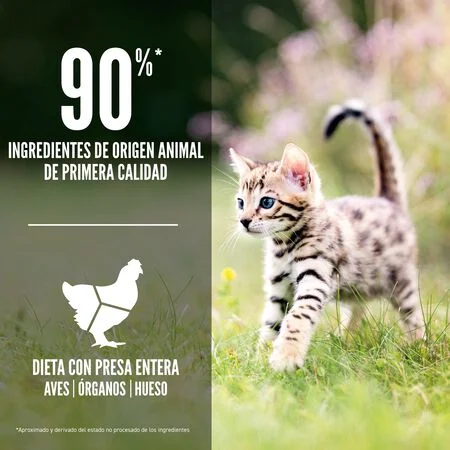 La dieta Orijen® Kitten está formulada especialmente para aportar a tu gatito los nutrientes que necesita para crecer sano y fuerte. Con un 90%1 de ingredientes de origen animal de calidad como pollo, pavo y salmón, que ayudan al desarrollo muscular del gatito en crecimiento. También contiene 15 ingredientes frescos o crudos2, incluyendo ingredientes de presa entera como carne, órganos y huesos, las partes suculentas y nutritivas de la presa. Esta dieta ayuda al desarrollo cerebral y la función cognitiva de tu gatito con DHA y EPA de origen natural, de salmón, arenque entero, caballa y aceite de abadejo. Ingredientes sin cereales3.
