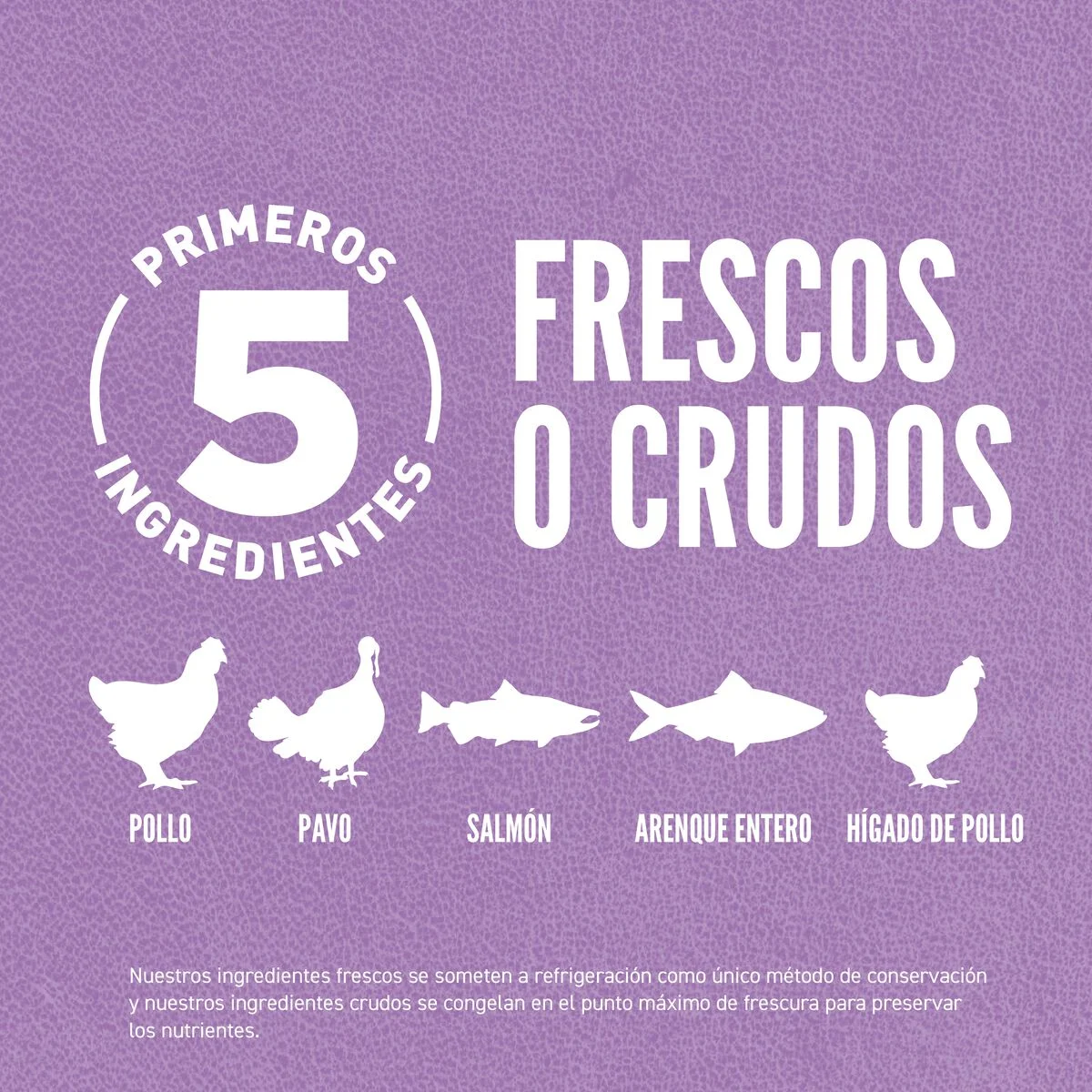 1Aproximado y derivado del estado no procesado de los ingredientes. 2Nuestros ingredientes se someten a refrigeración como único método de conservación y nuestros ingredientes crudos se congelan en el punto máximo de frescura. Producido en una instalación que también procesa cereales3.