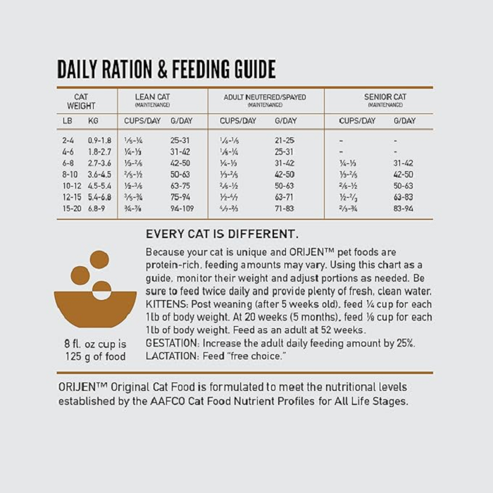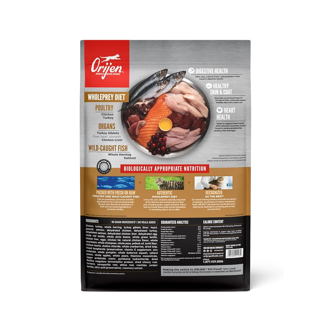 La dieta Orijen® Orignal Cat está hecha con pollo y pavo frescos o crudos 1 de corral 2 y pescado capturado en estado salvaje. Repleta de ingredientes animales WholePrey como aves de corral, pescado, órganos y huesos, la dieta Orijen® Orignal Cat está hecha con las partes más ricas en nutrientes y suculentas de la presa para brindar la nutrición que los gatos necesitan. Con un 85 % 3 de ingredientes animales de calidad y un recubrimiento de hígado liofilizado, esta dieta no tiene comparación.