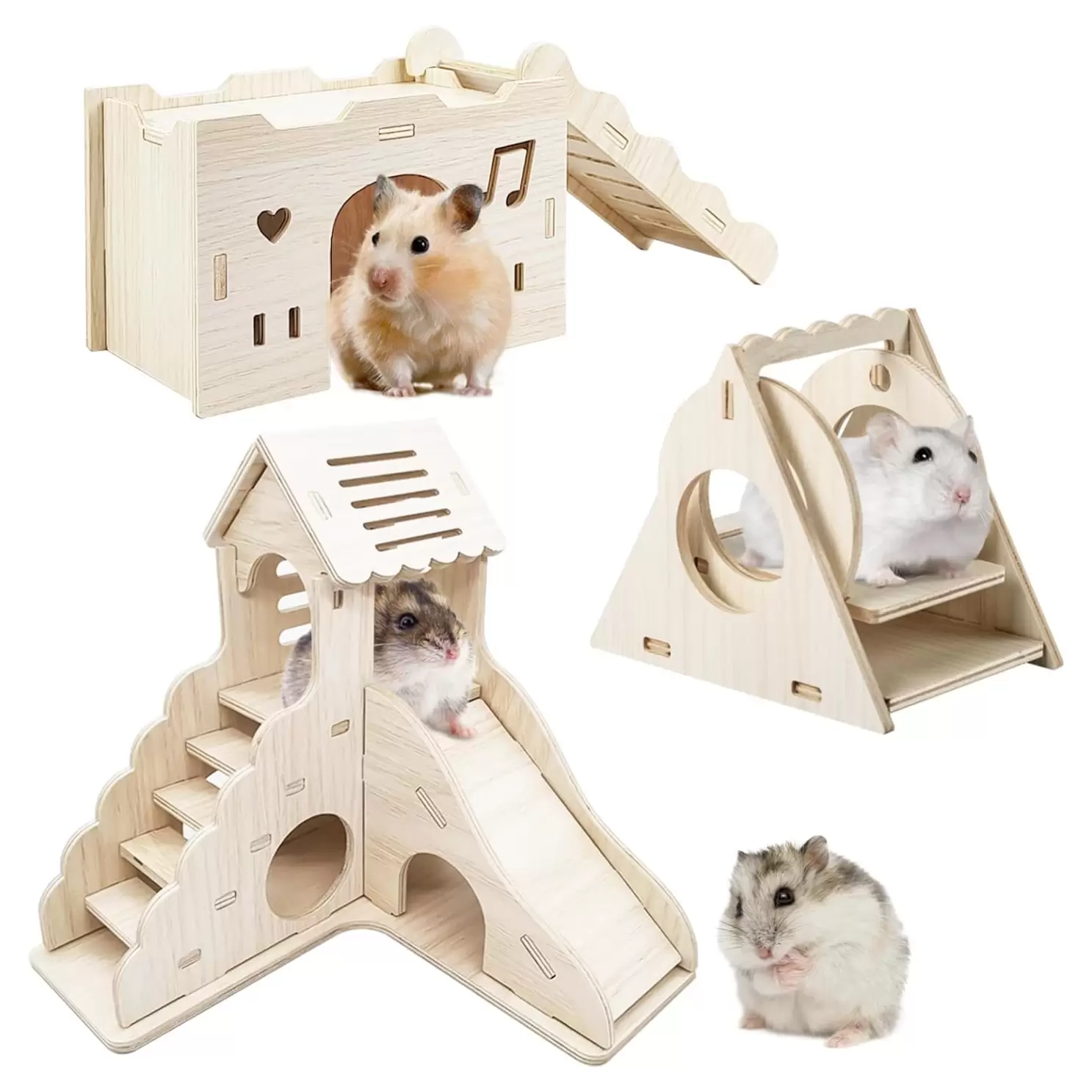 Contenido del paquete: 2 estilos diferentes de casas para hámster, 1 columpio de madera y 1 puente de plataforma.