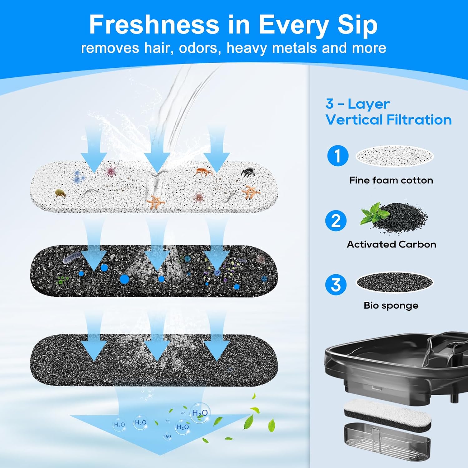Filtración vertical de 3 capas: 1. El pelo fino del filtro del algodón de la espuma y los residuos de la comida, captura las impurezas 2. El carbón activado elimina olores ofensivos, eliminación de cloro y metales del agua. 3. La esponja bio absorbe el olor y mejora el sabor.
