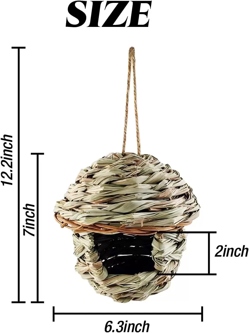 Estos nidos de paja natural, tejidos a mano, ofrecen a los pájaros un refugio duradero y ventilado. Su diseño colgante es perfecto para proteger a las aves de la intemperie, manteniendo su comodidad.