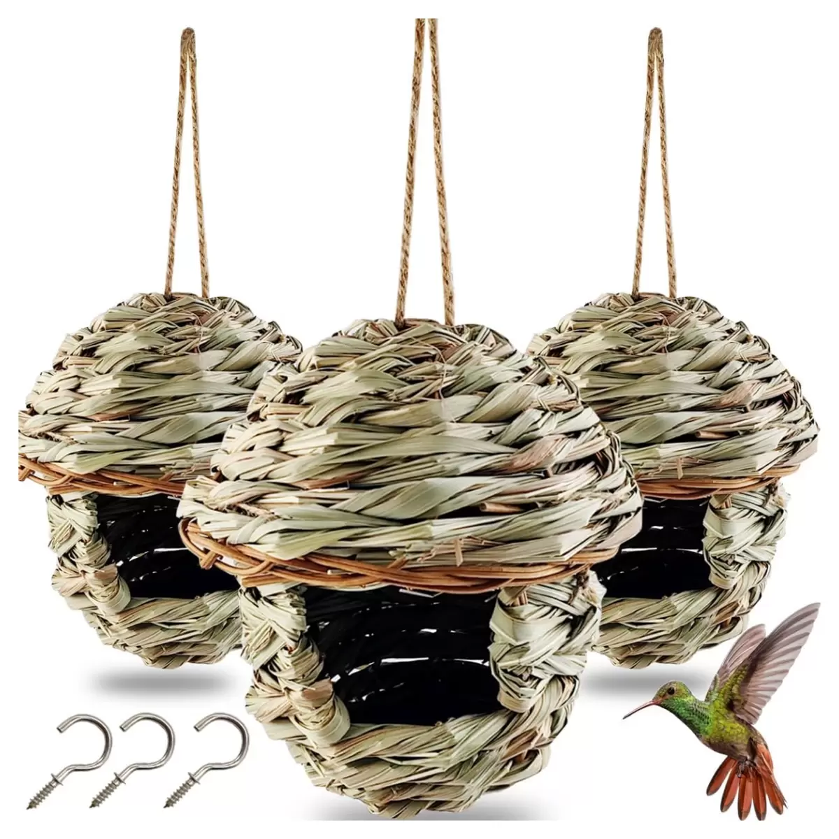 Pack de 3 Casas de Pájaros Tejidas a Mano | Nidos Colgantes de Paja Natural para Exterior