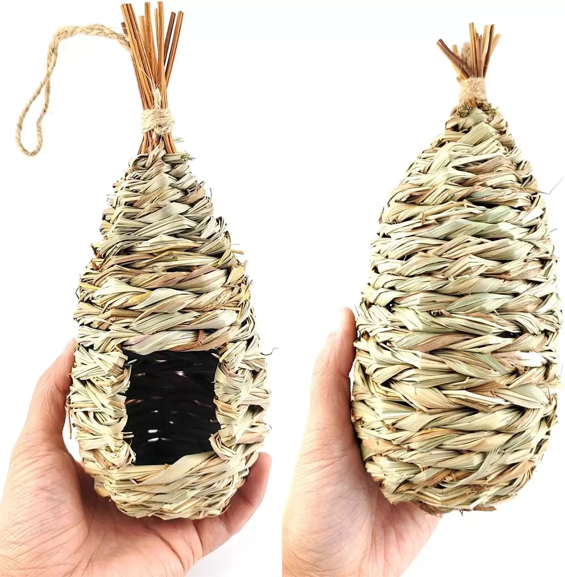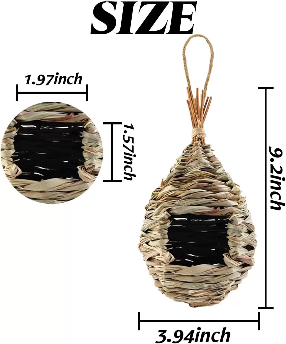 Tamaño: 9.2 x 3.94 pulgadas. Proporciona un escondite seguro para las aves que escapan de los depredadores. La apariencia áspera puede aumentar la fricción con las patas del pajarito y mantenerse más estable. La hermosa casa para pájaros en forma de gota con fondo ancho hace suficiente espacio para moverse.