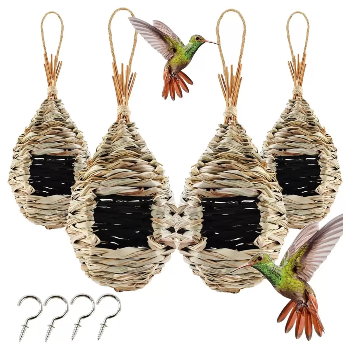 Pack de 4 Casas de Pájaros Tejidas a Mano | Nidos de Hierba de Hibisco para Interior y Exterior