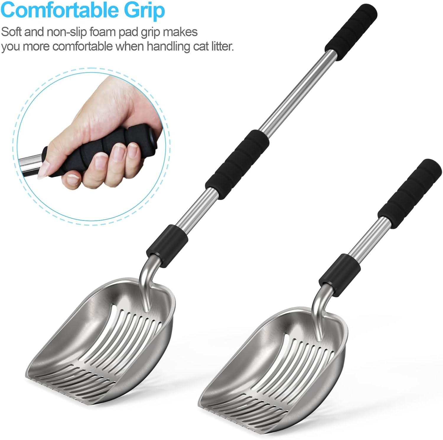 Mango largo desmontable: la longitud del mango de la pala de arena para gatos se puede ajustar de 16″ a 32″. El mango largo puede mantenerte alejado de los desechos de los gatos y reduce el estrés en tu espalda, lo que hace que esta pala de arena de acero inoxidable sea más fácil de manejar la arena