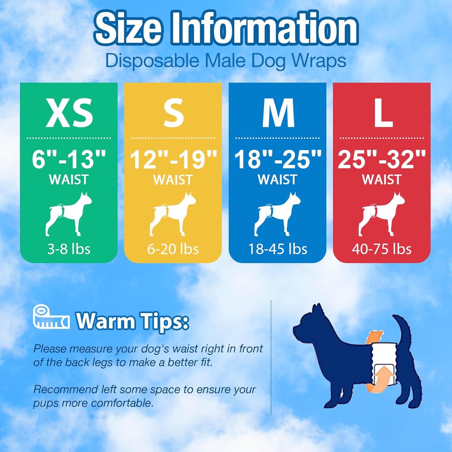 Pañales para perros machos: pañales grandes para perros con un tamaño de cintura de aproximadamente 25 a 32 pulgadas, ideales para perros medianos o grandes, como Golden Retriever, Labradores, 40-75 libras. Mide los datos de la cintura de los perros delante de las patas traseras para lograr un mejor ajuste y deja algo de espacio para garantizar la comodidad.