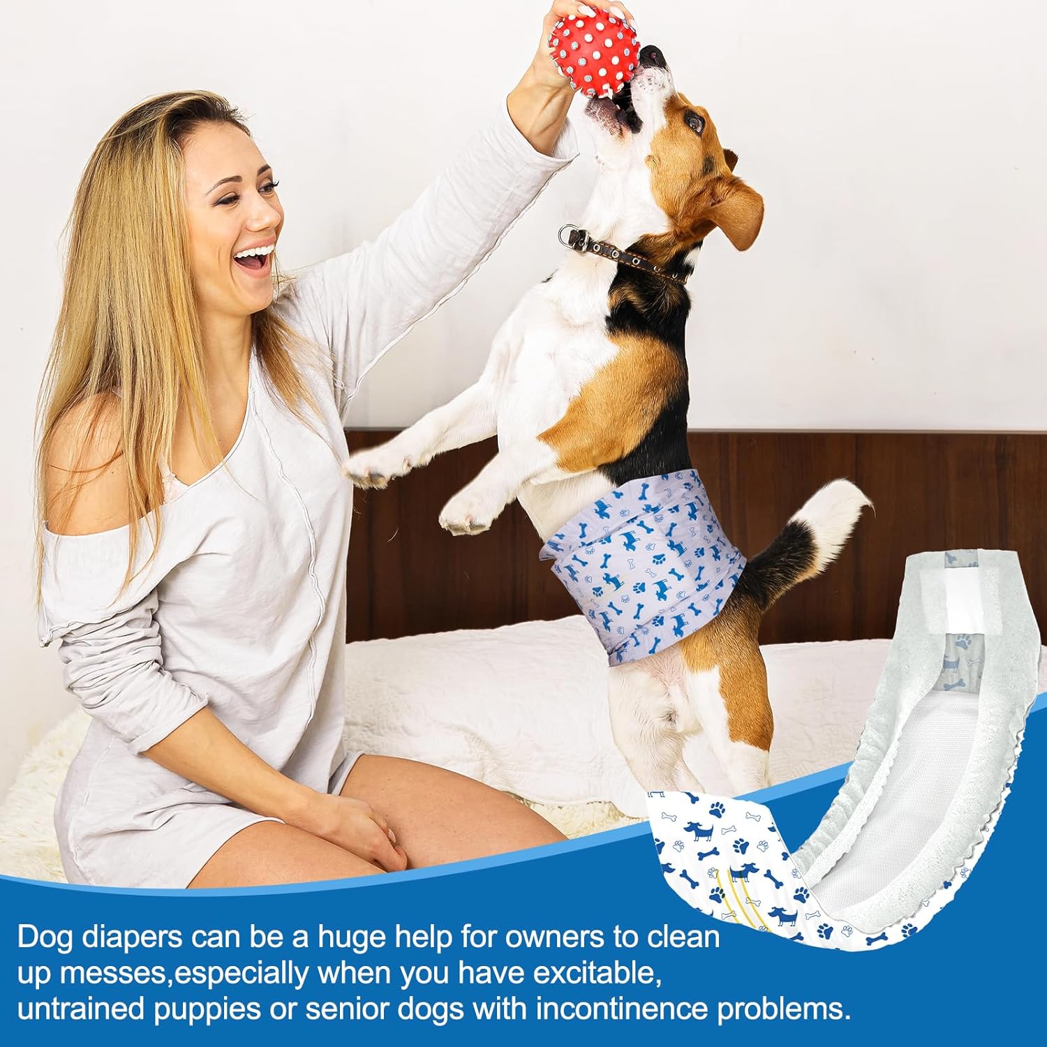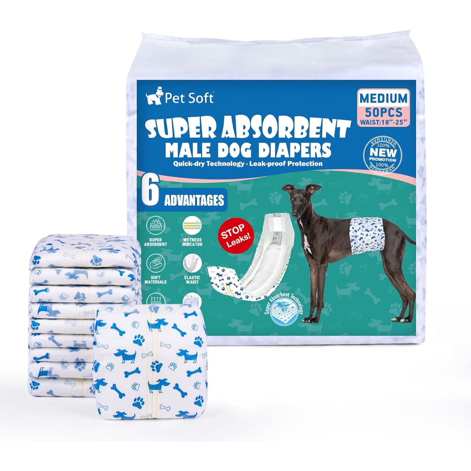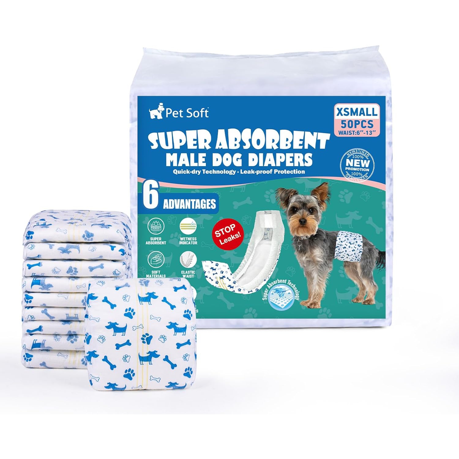 Protección antifugas: 50 unidades por paquete, con patrón azul de perro y huesos. Nuestros pañales para perros proporcionan a tu cachorro una protección a prueba de fugas de 360°, el núcleo súper absorbente puede absorber la orina rápidamente, traer más comodidad a los cachorros.