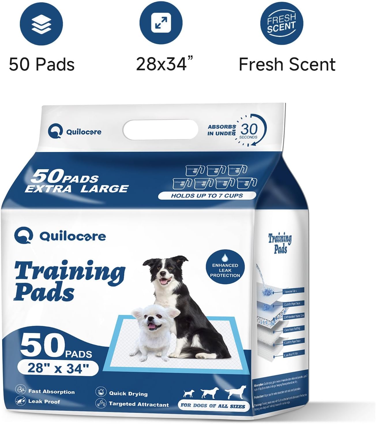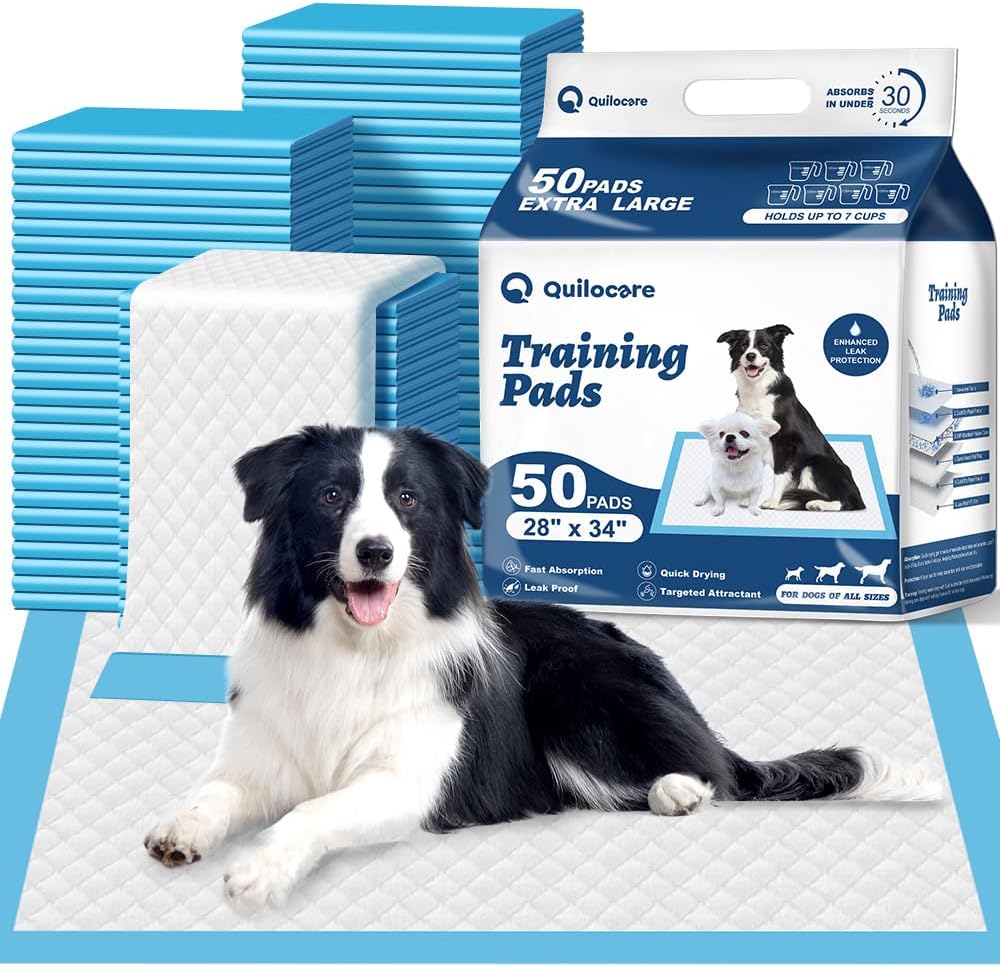 Paquete a granel rentable: Quilocare 28 “x 34” almohadillas grandes para orina de perro 50 unidades y requieren menos cambios que las almohadillas estándar. Garantizará un suministro constante para las necesidades de entrenamiento de tu cachorro, ahorrándote tiempo y molestias.