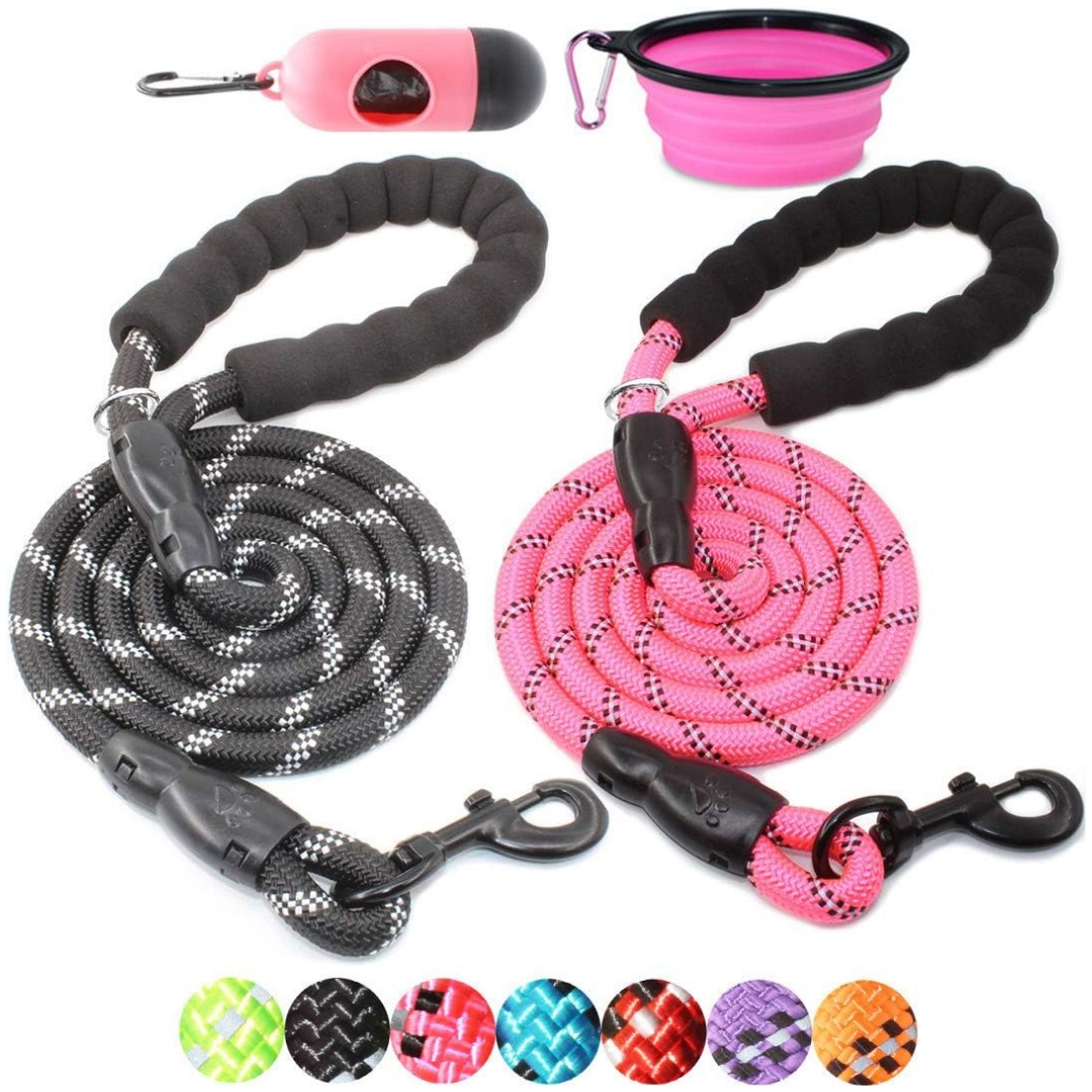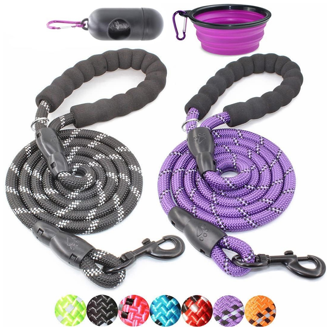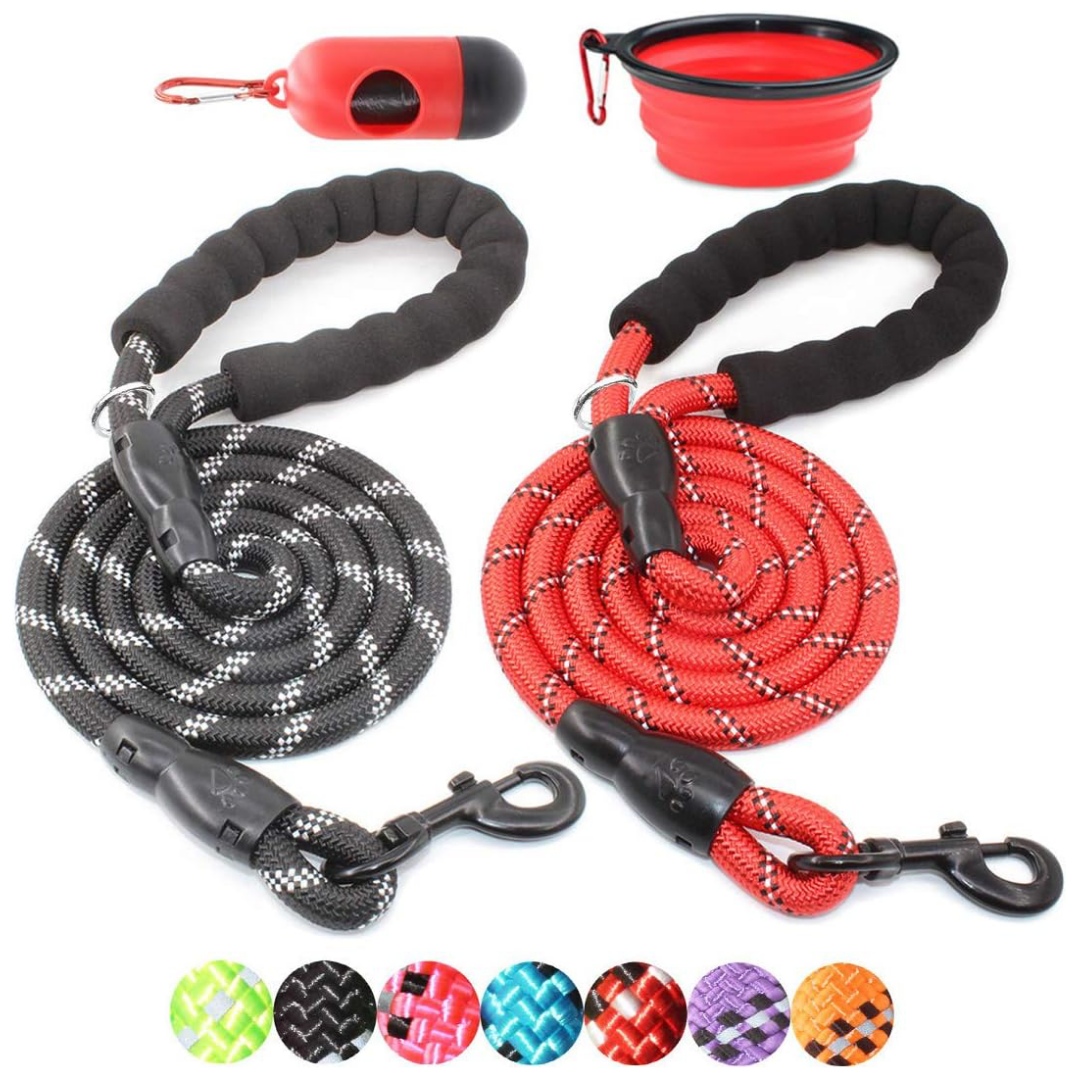 Bono adicional: este paquete de dos correas de cuerda de 5 pies de largo no solo incluye el cuenco plegable de silicona y también el dispensador de bolsas para excrementos con bolsas como gran ventaja