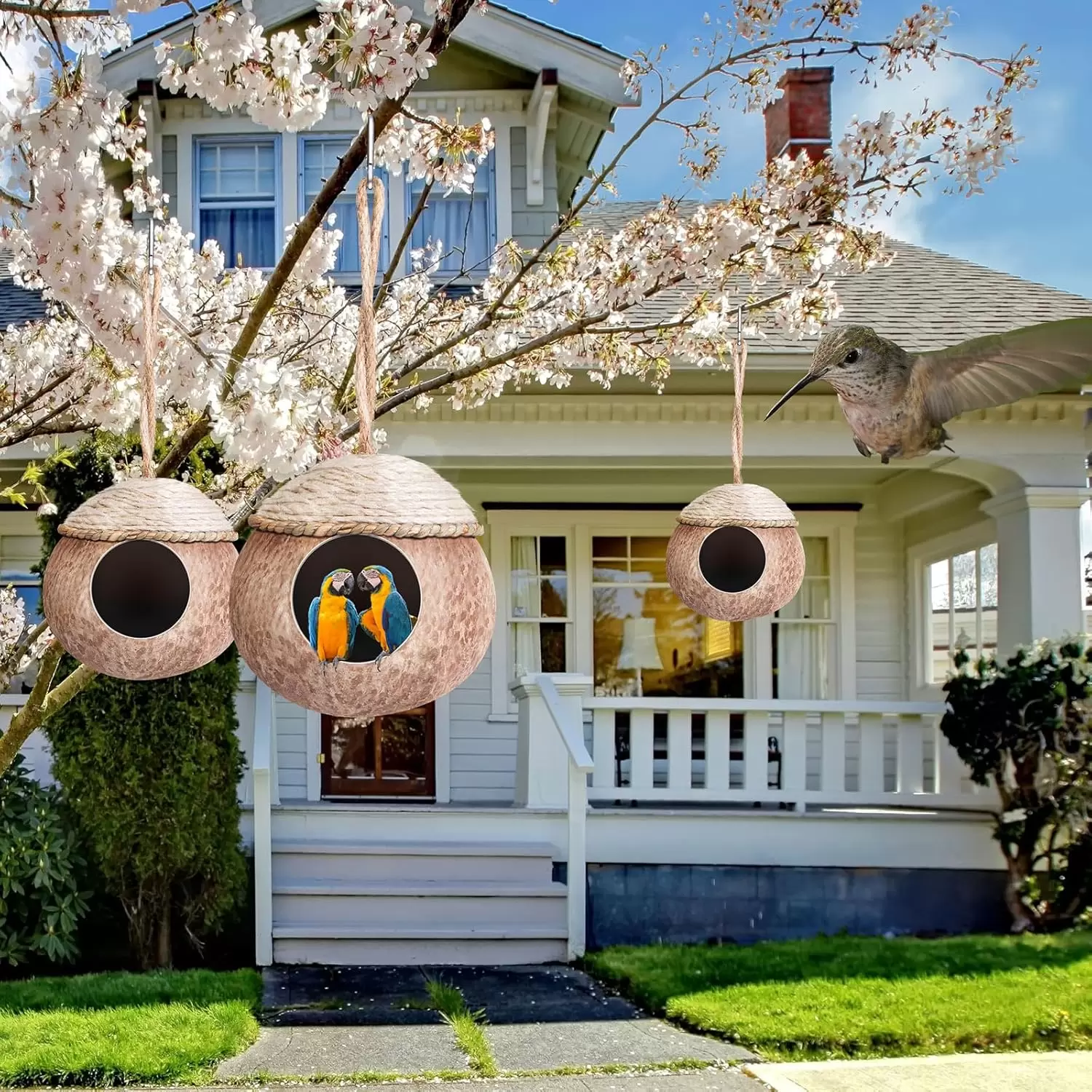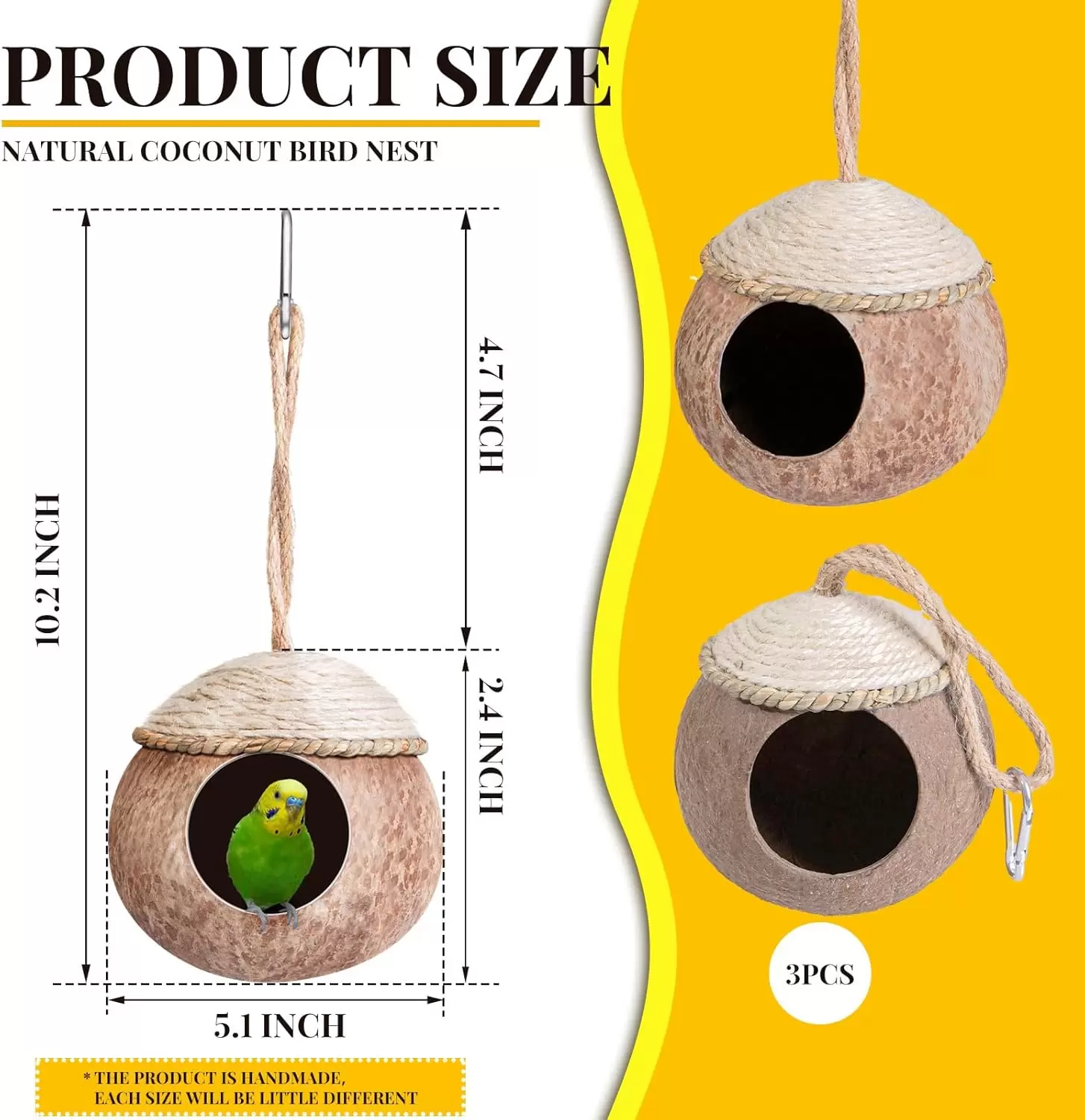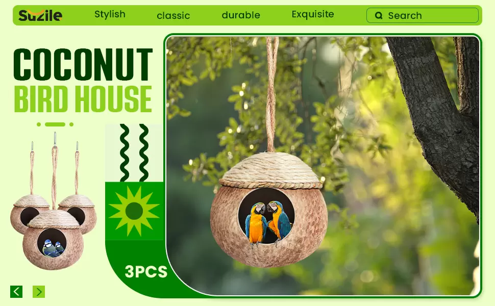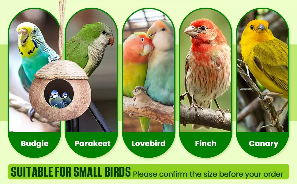 Suministro consistente: cada paquete contiene 3 casas de coco para pájaros, lo que permite a los dueños de mascotas reemplazarlo rápidamente una vez que esté desgastado o colocarlos en diferentes lugares si tienen varias aves; este suministro constante ayuda a mantener un ambiente limpio y saludable para tus pájaros