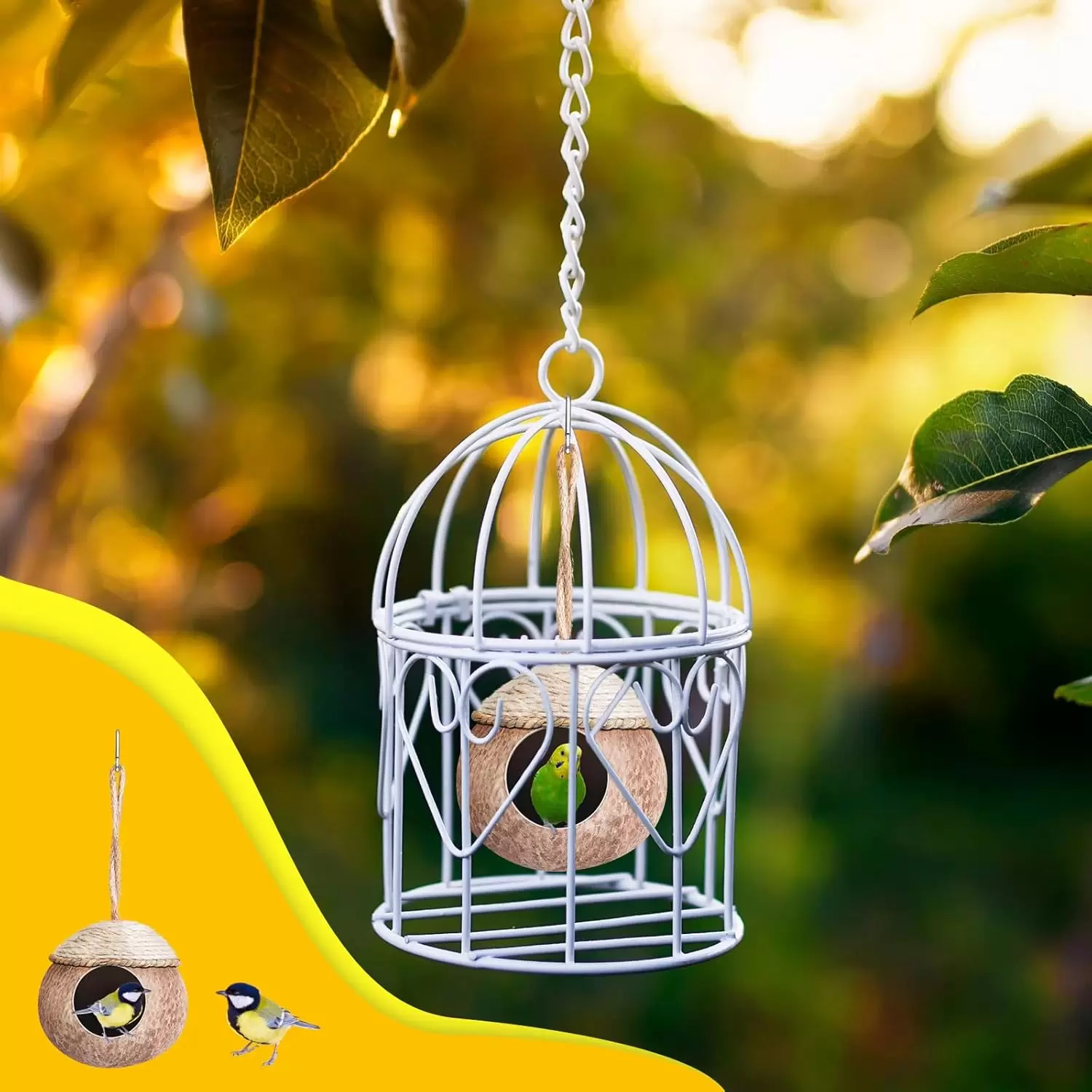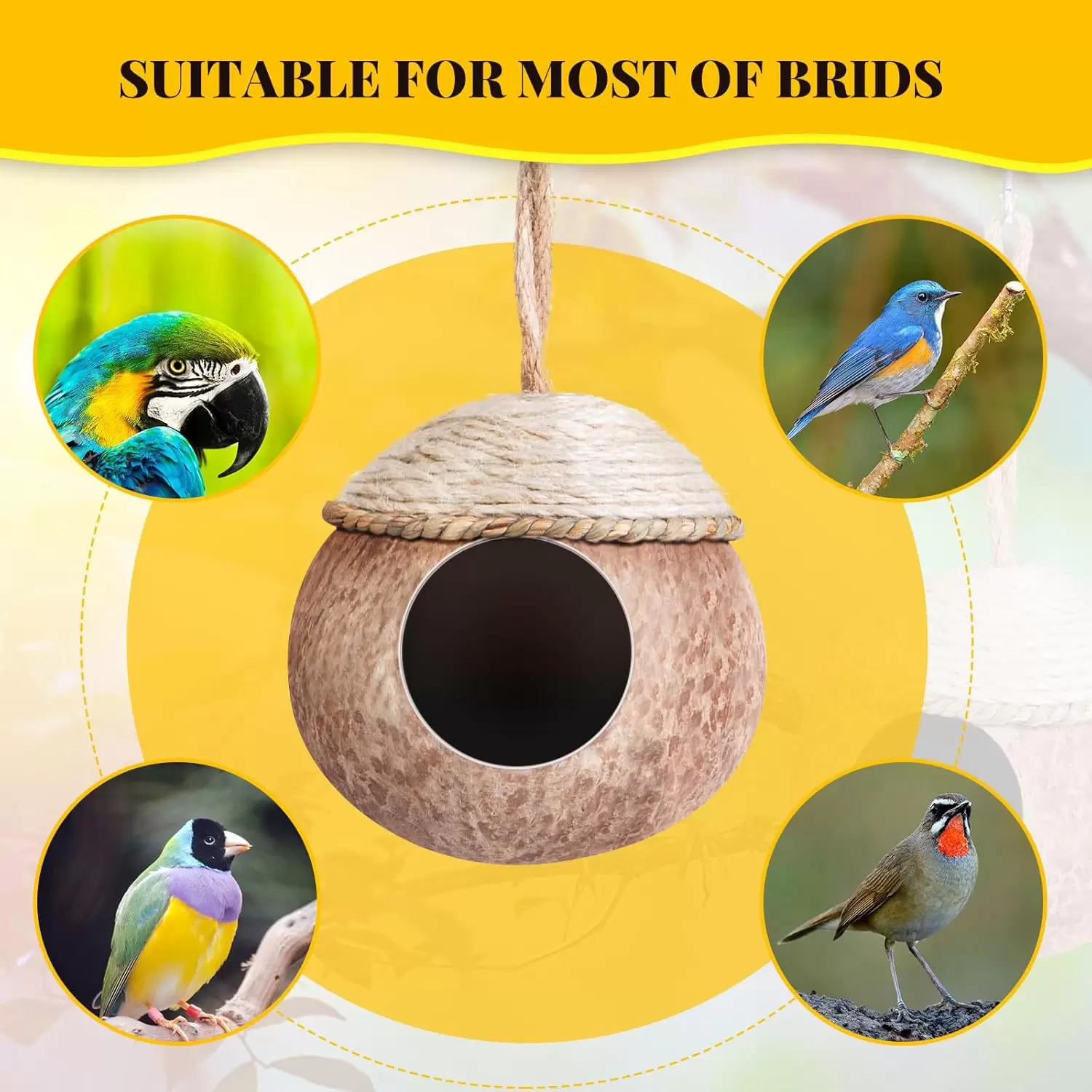 Cómodo hogar para pájaros: diseñado con pajitas tejidas y cáscaras de coco pulidas, este nido de periquitos es cómodo; las aves disfrutarán del ambiente cómodo que la concha y la paja crean, haciéndolos sentir seguros y relajados