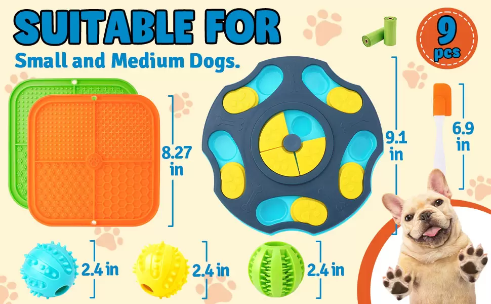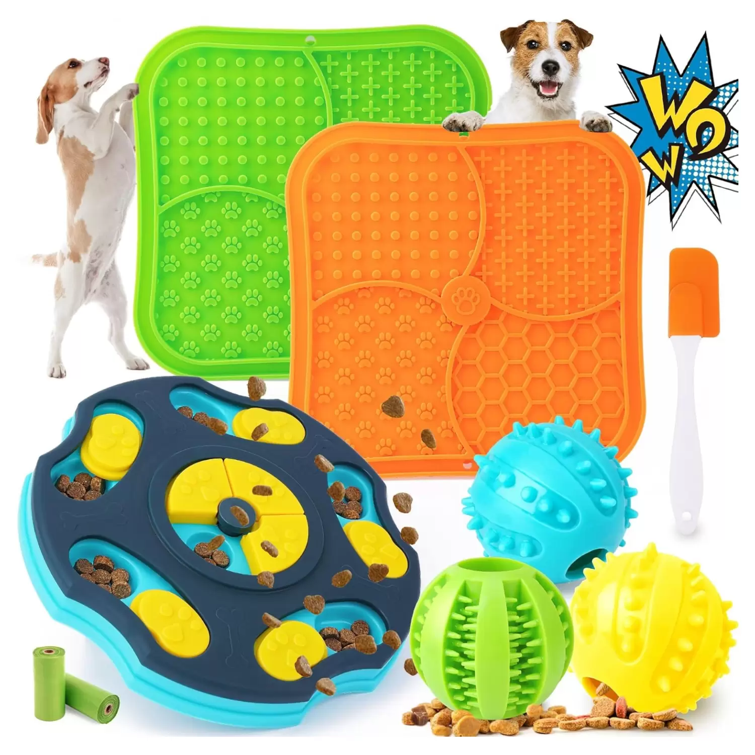 Juego de juguetes de enriquecimiento para perros: el juego incluye 2 alfombrillas para lamer con ventosas, 1 juguete de rompecabezas, 3 bolas de golosinas, 1 espátula de silicona, 1 cepillo y 2 bolsas. Adecuado para diversas actividades, incluyendo el uso de bolas de regalo en interiores o encontrar el juguete de rompecabezas en el jardín