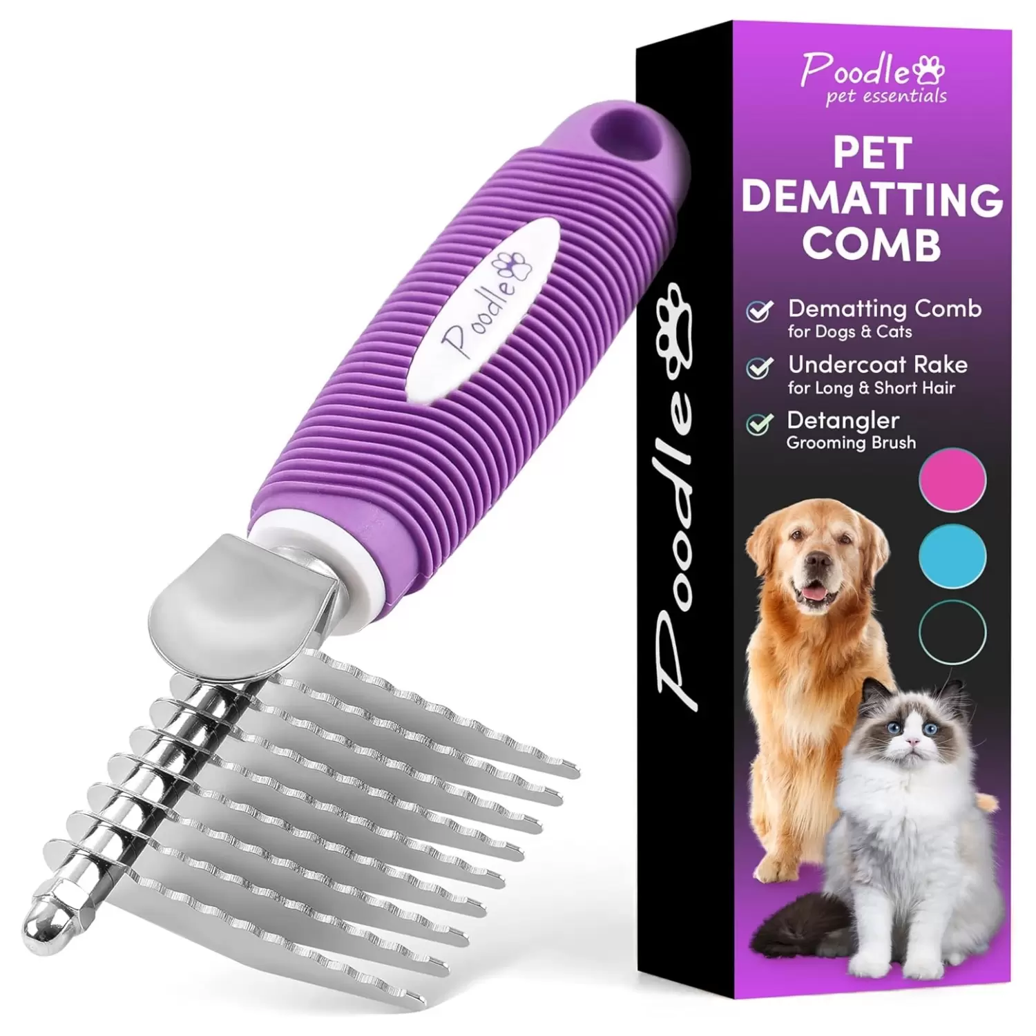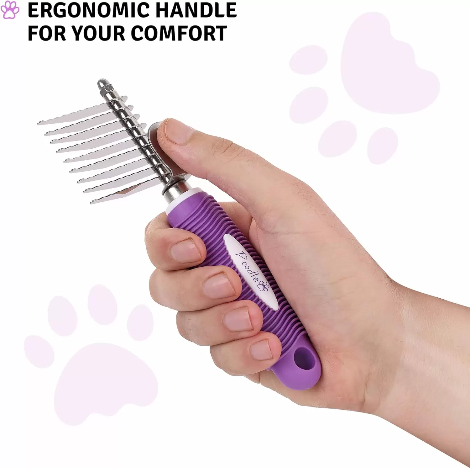 Mango de fácil agarre: ¡Con un práctico agujero para colgar! Con un mango que ha sido hecho de goma resistente y texturizado con bordes ondulados, el rastrillo de aseo Poodle Pet se adapta cómodamente a la mano para evitar resbalones que provocan accidentes. Seguro para su uso en pelo húmedo o seco de mascotas.