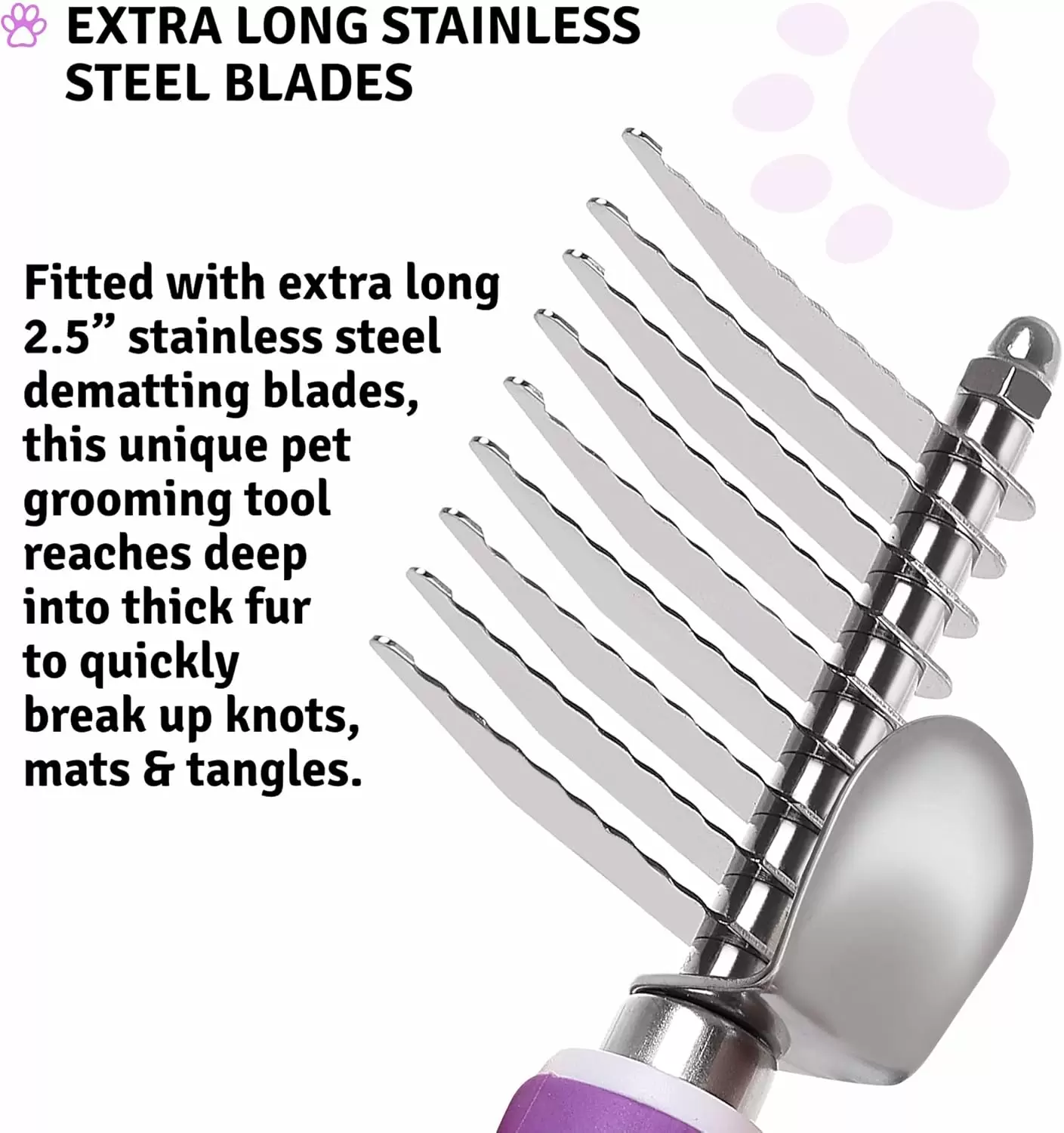 Cuchillas largas de acero: equipado con cuchillas de desenmascaramiento de acero inoxidable extra largas de 2.5 pulgadas, esta herramienta única de aseo para mascotas llega profundamente en el pelaje grueso para romper rápidamente nudos, tapetes y enredos. Es el mejor rastrillo de aseo para el cepillado de la capa inferior