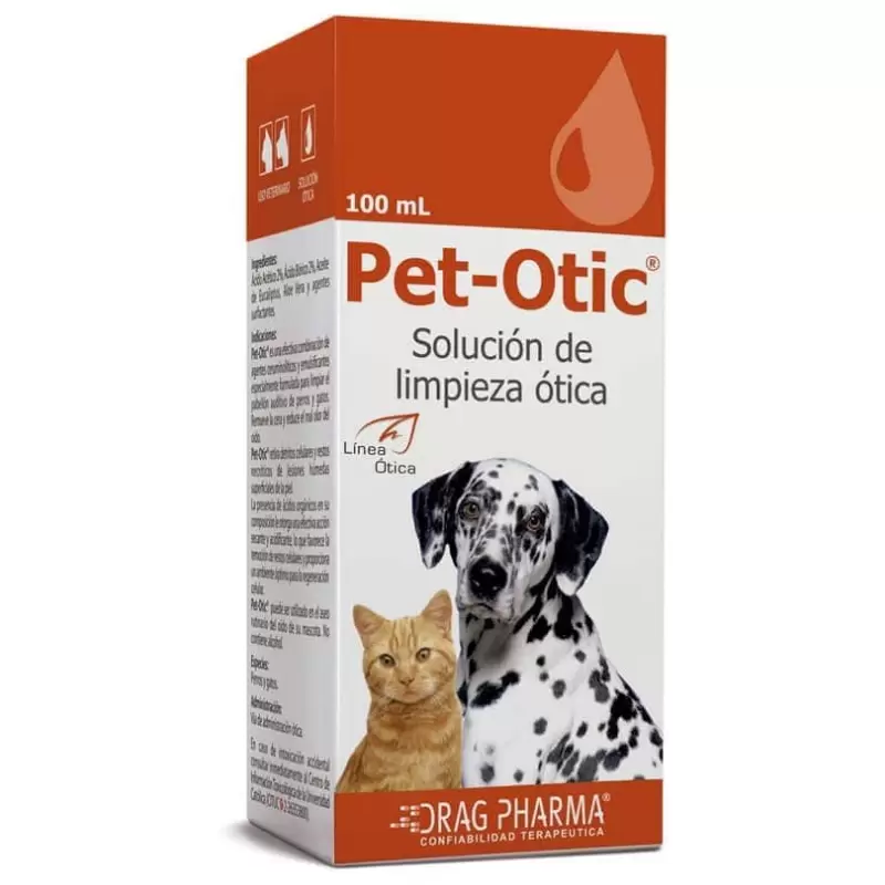 Pet-Otic (100 mL) es una solucion de Drag Pharma para la limpieza de oidos de mascotas. Remueve cera y detritos, reduce el mal olor y contiene Acido Acetico y Aloe Vera para una limpieza profunda y calmante.