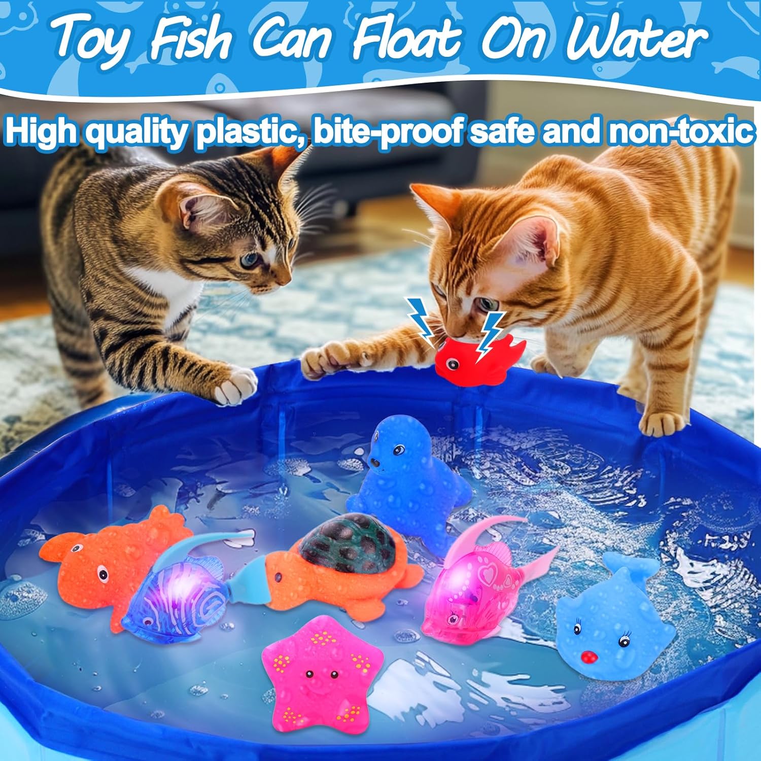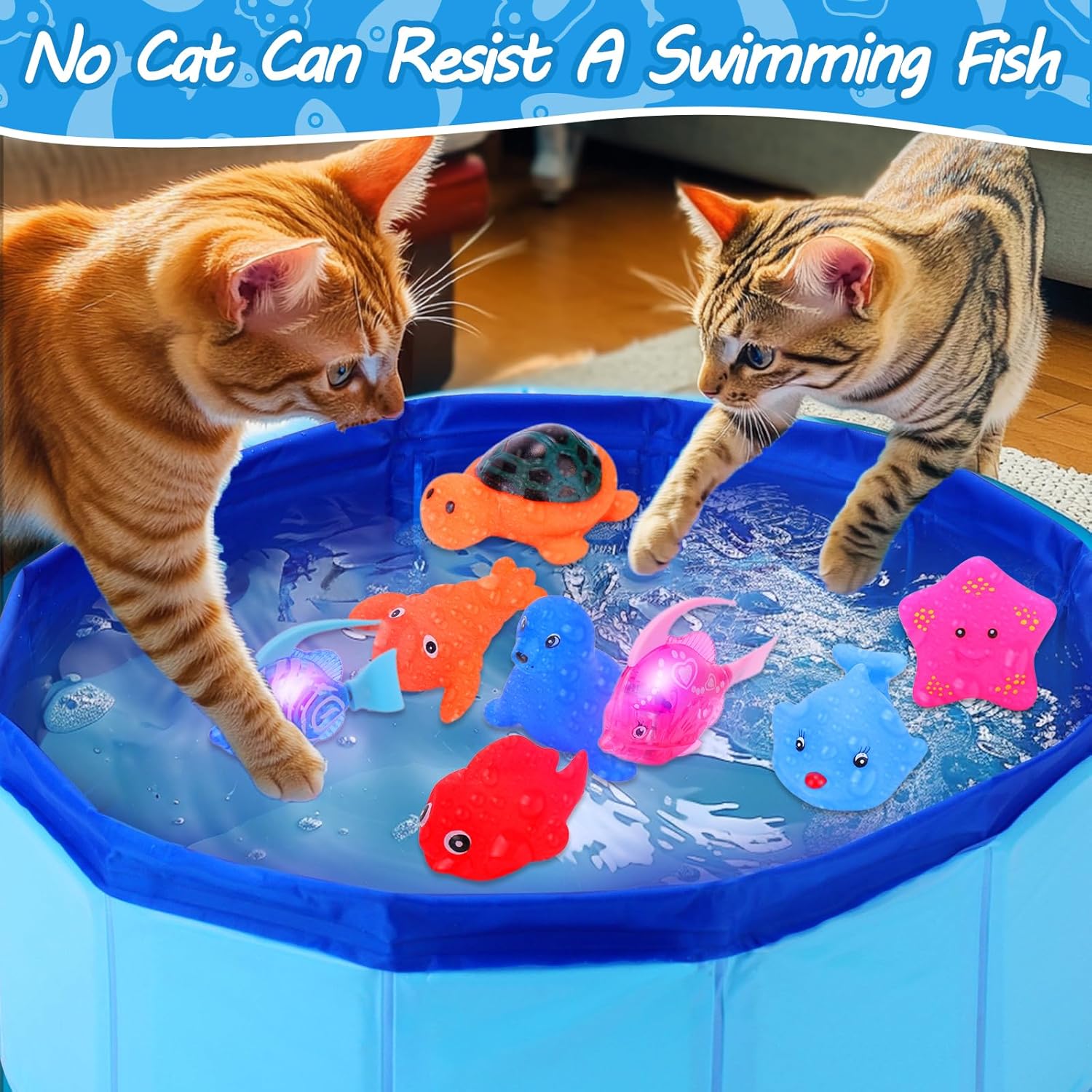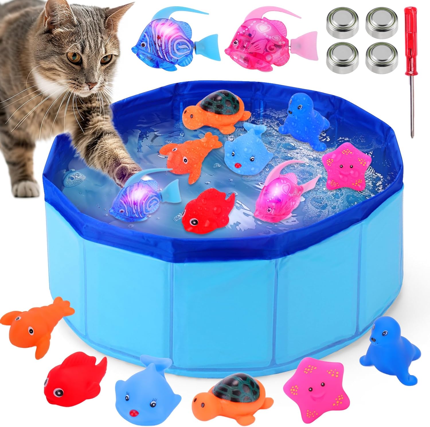 Juguete ideal para gatos: nuestros juguetes para gatos incluyen una piscina para gatos, 2 juguetes robóticos de peces con luces, 6 juguetes de peces flotantes chirriantes, 4 baterías adicionales y un destornillador para cambiar los juguetes robóticos de peces.