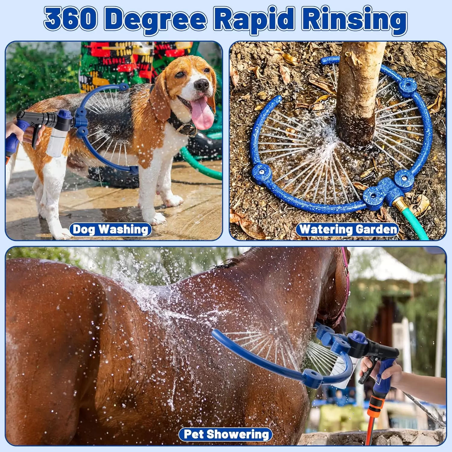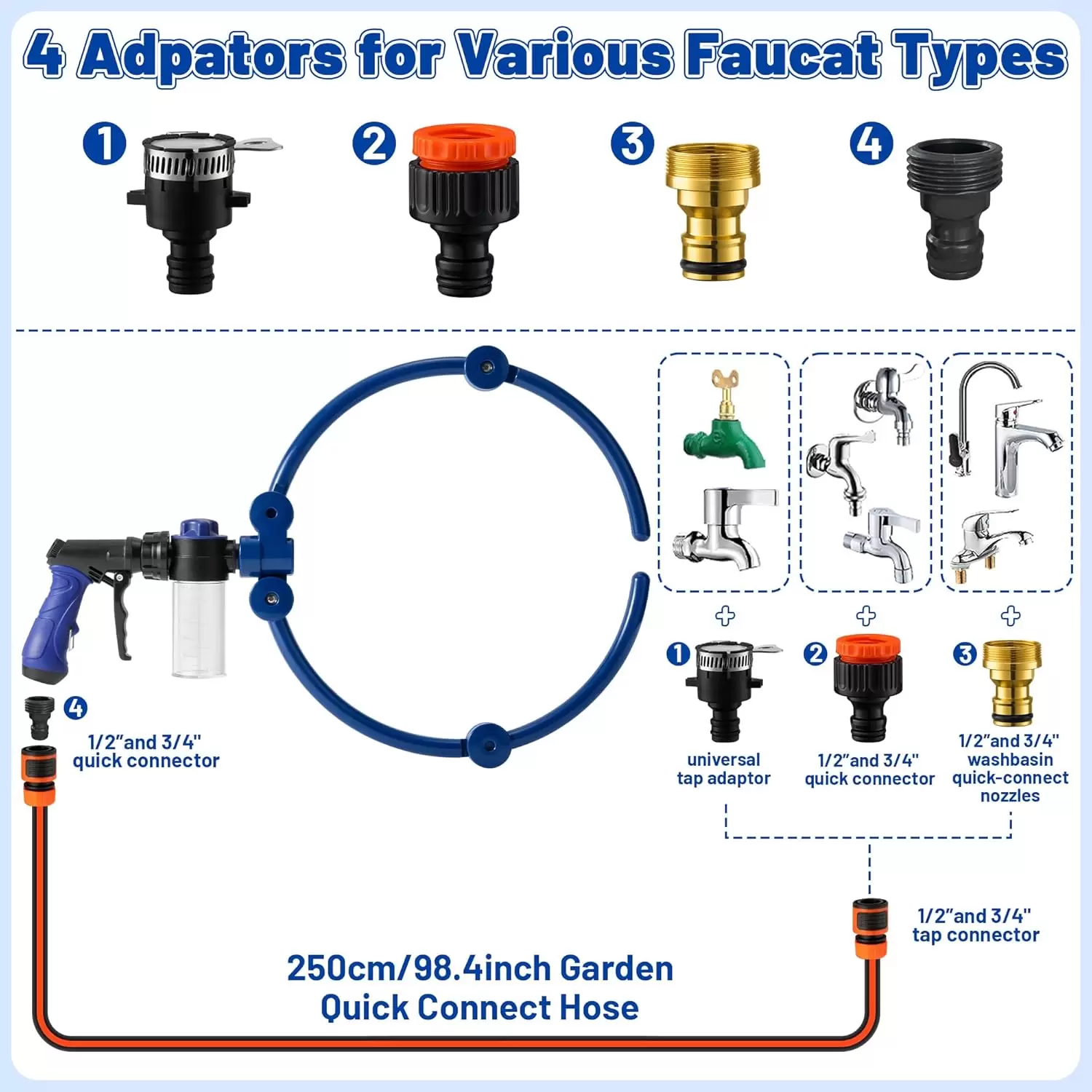 [Se adapta a grifos y mangueras de 1/2 y 3/4 pulgadas] Te equipa con accesorios universales estándar de 1/2 y 3/4 pulgadas y manguera de conexión rápida de jardín de 8.2 pies, que puede estar lista para instalar y usar directamente. Es adecuado para baño en aerosol para mascotas en interiores y exteriores, riego, limpieza.